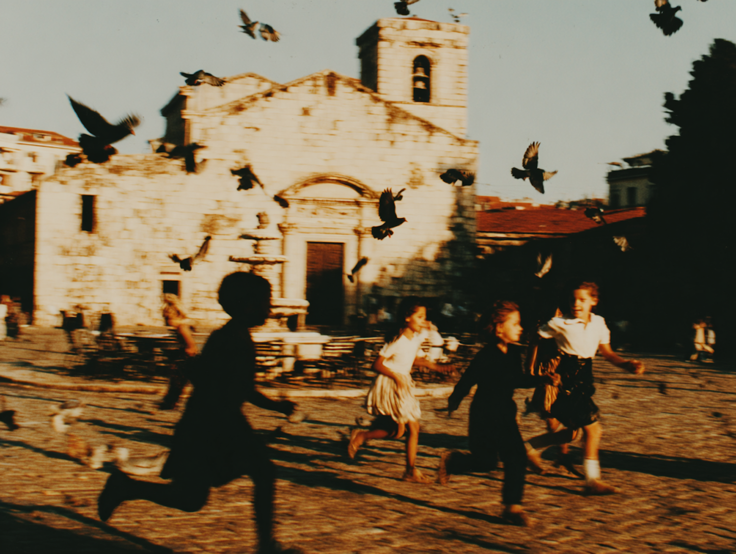 Children running in a sunlit square with pigeons flying around, set against the backdrop of an old stone church.