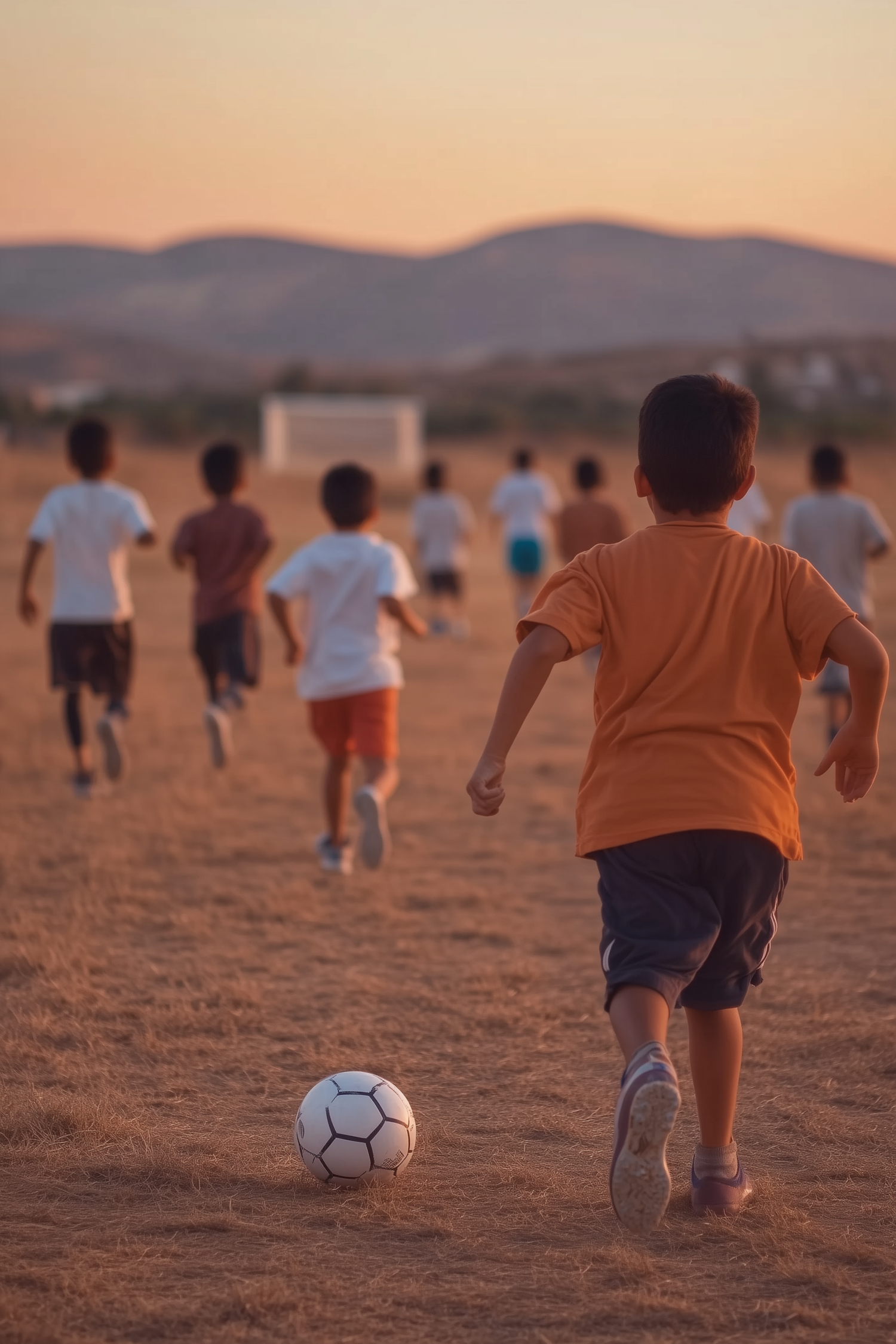 Children playing soccer at sunset on a dry field, with a focus on a boy in an orange shirt running towards the ball.