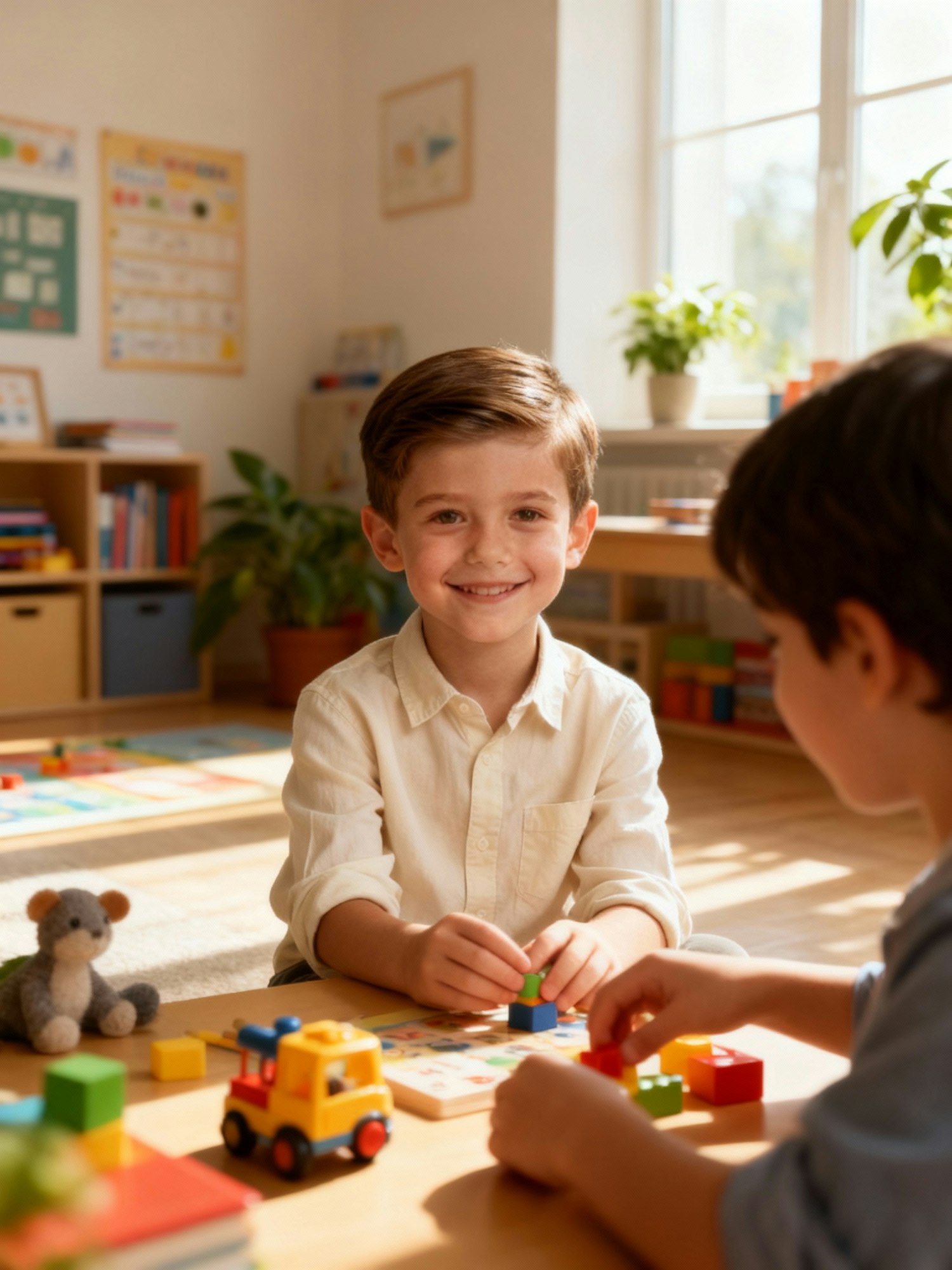 Two children playing with colorful toys in a bright, sunlit room, surrounded by books and plants, creating a cozy and educational vibe.