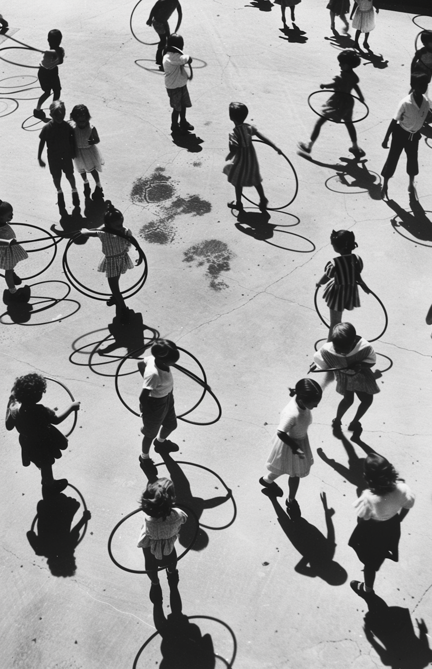 Children playing with hula hoops on a sunny day, casting playful shadows on the ground. Black and white photo capturing childhood joy.