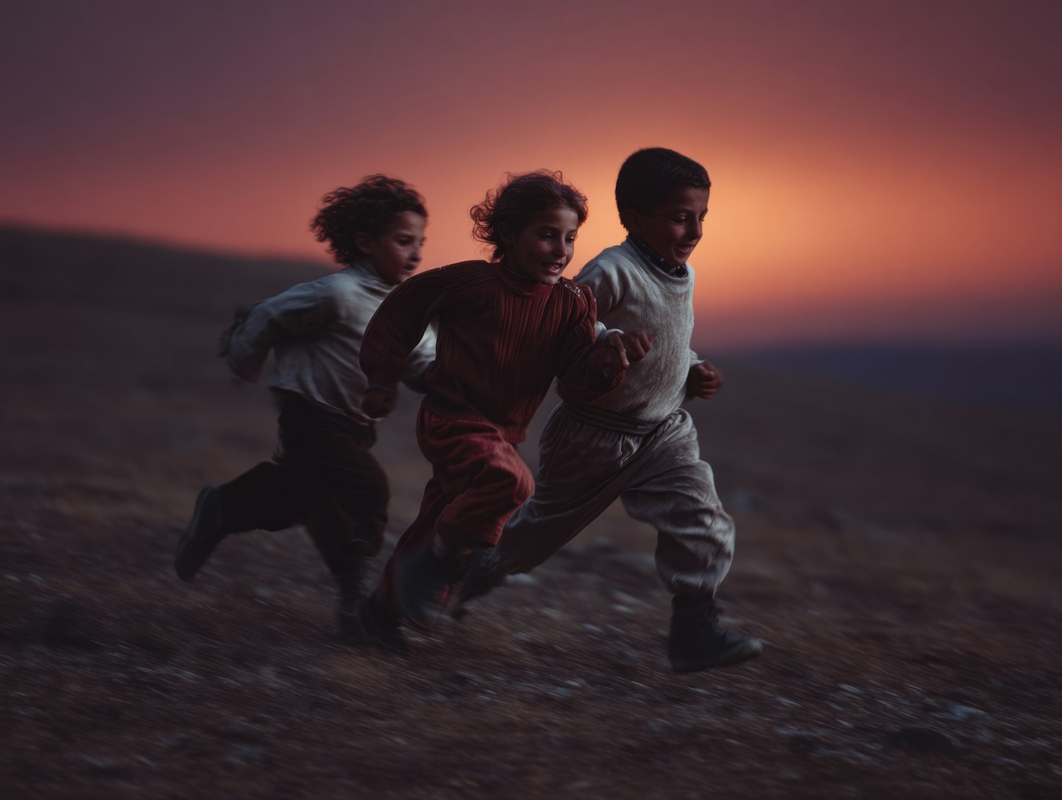 Three children run joyfully across a field at sunset, their expressions full of happiness and energy, with a vibrant sky in the background.