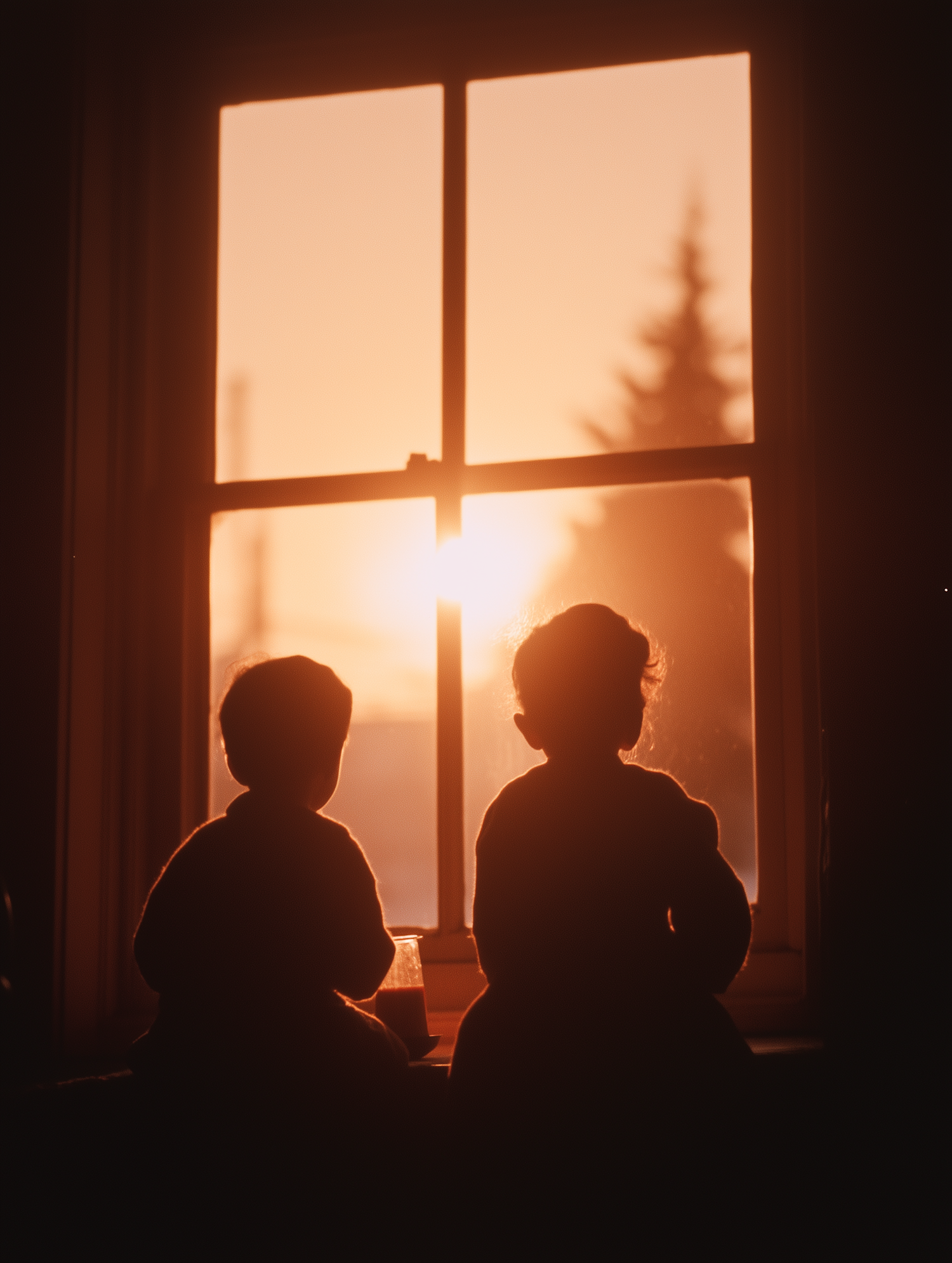 Silhouetted children by a window at sunset, creating a warm, serene scene with rich orange hues and a peaceful atmosphere.