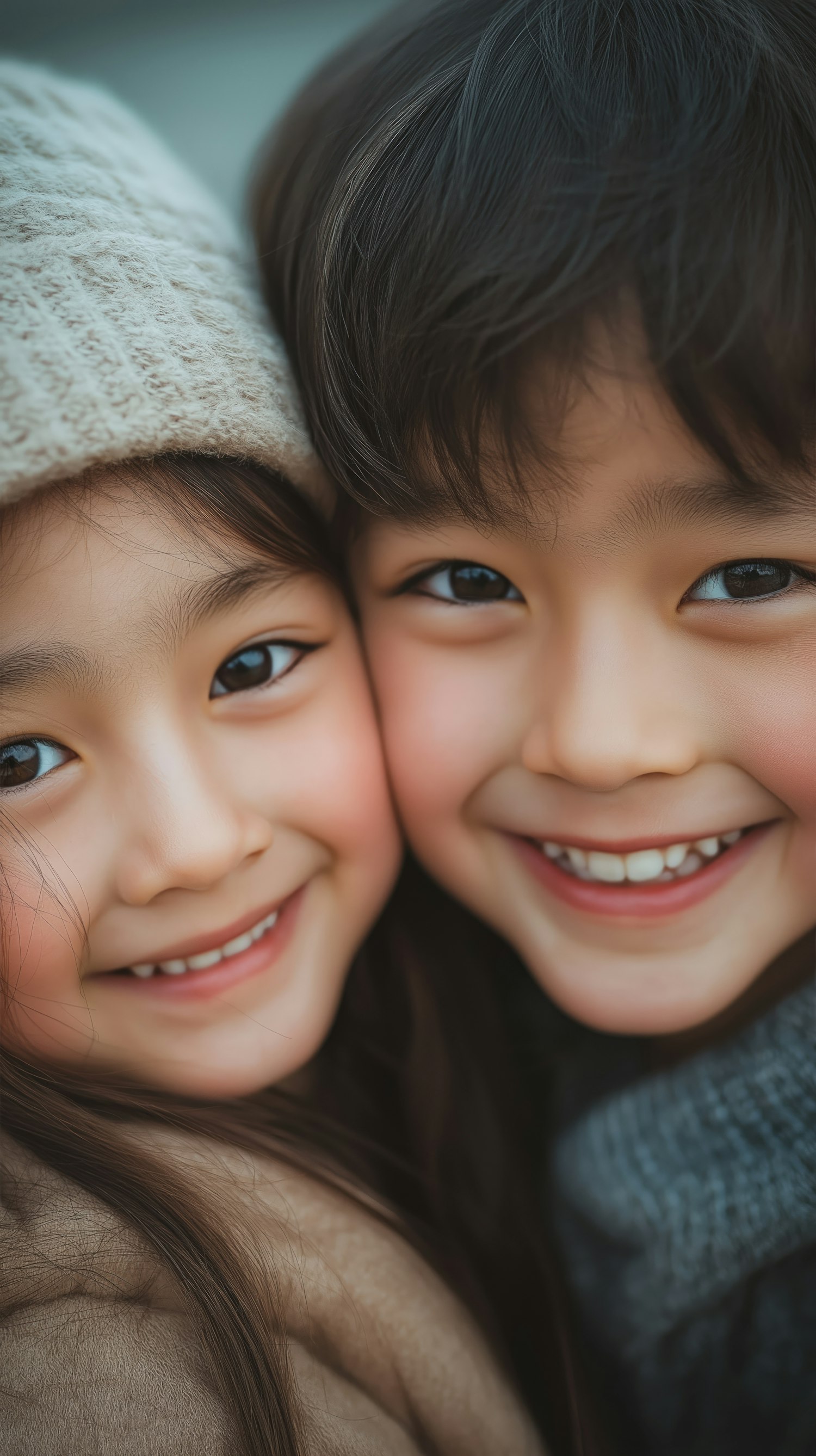 Two smiling children with rosy cheeks and dark eyes, close together, exuding warmth and joy. One wears a knit hat, the other has wavy hair.