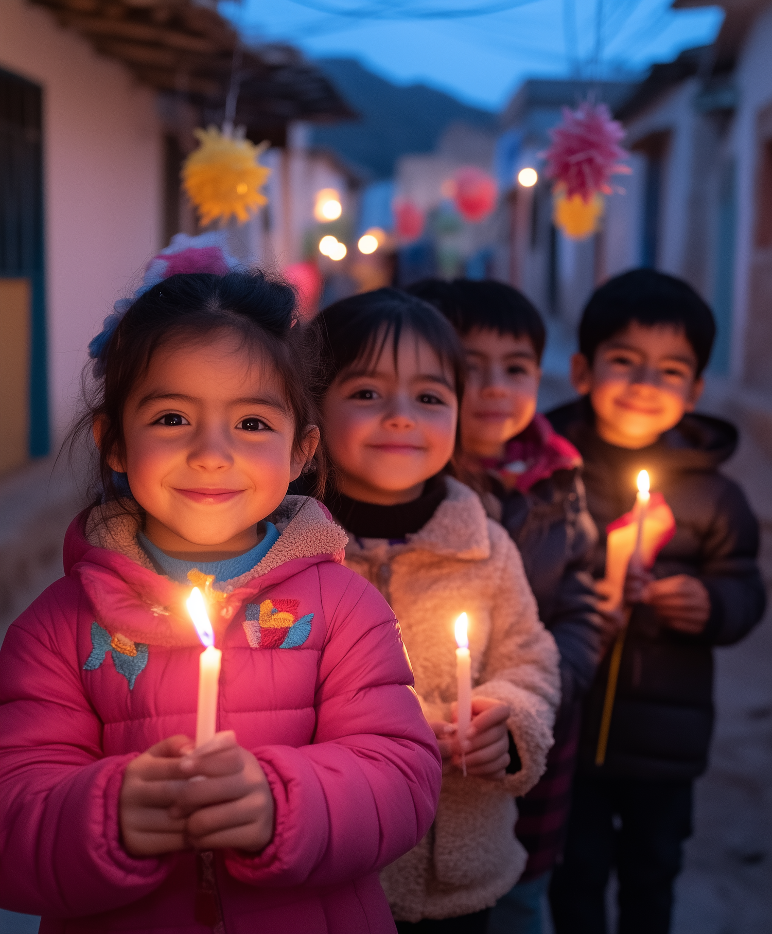 Children holding candles in a festive street setting, smiling warmly in the soft glow of candlelight.