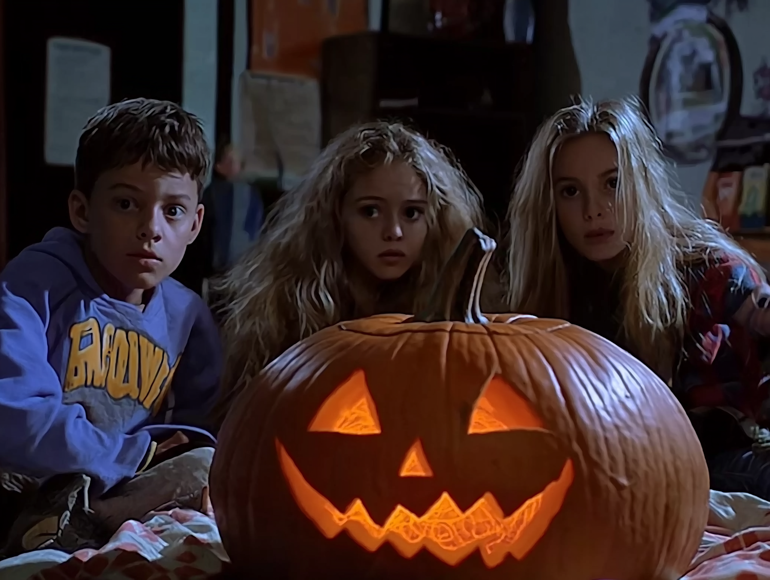 Three children gaze at a glowing jack-o'-lantern, their faces lit by its eerie light, creating a spooky Halloween atmosphere.