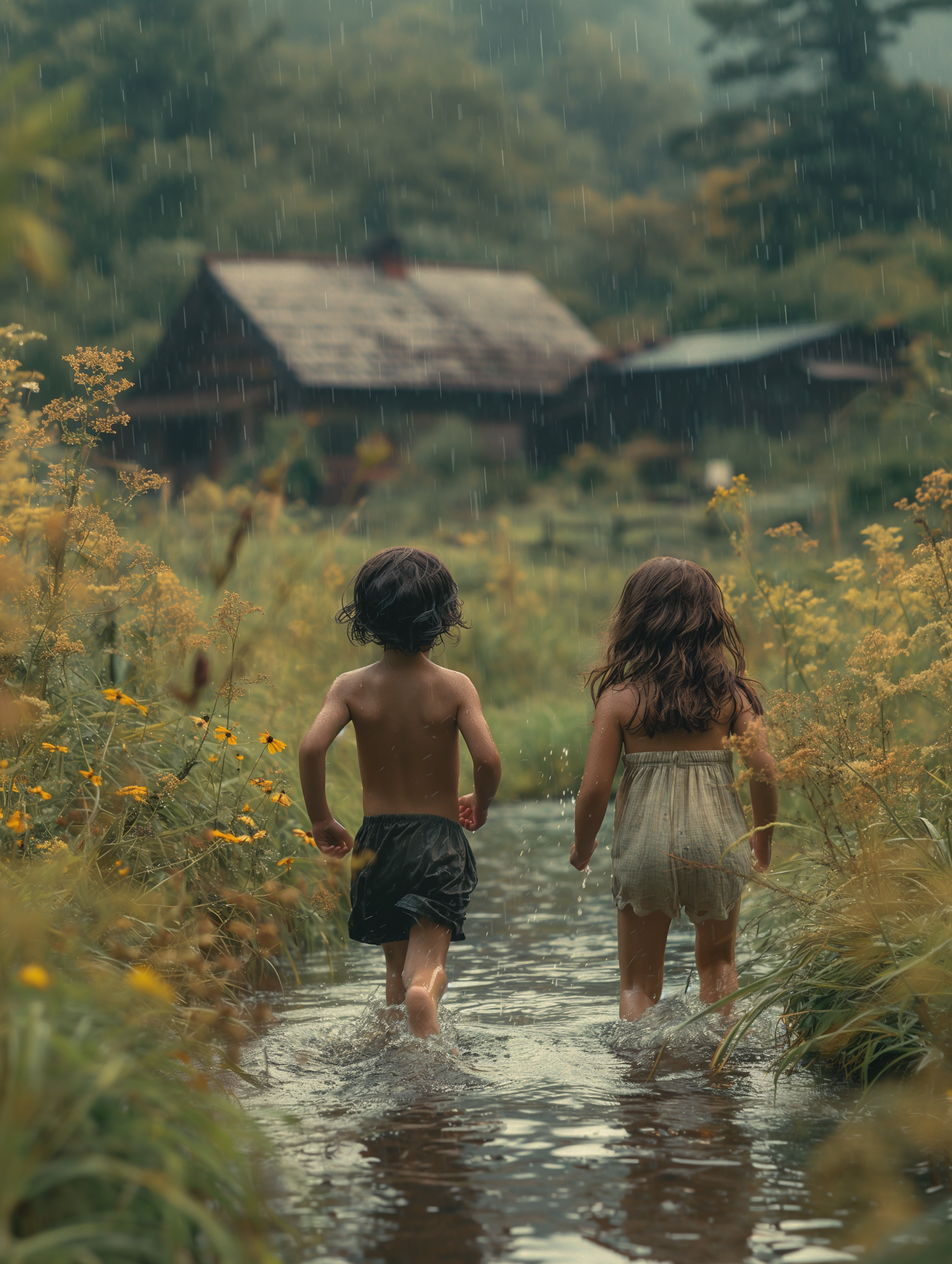 Two children walk through a rainy meadow stream towards a rustic cabin, surrounded by lush greenery and wildflowers.