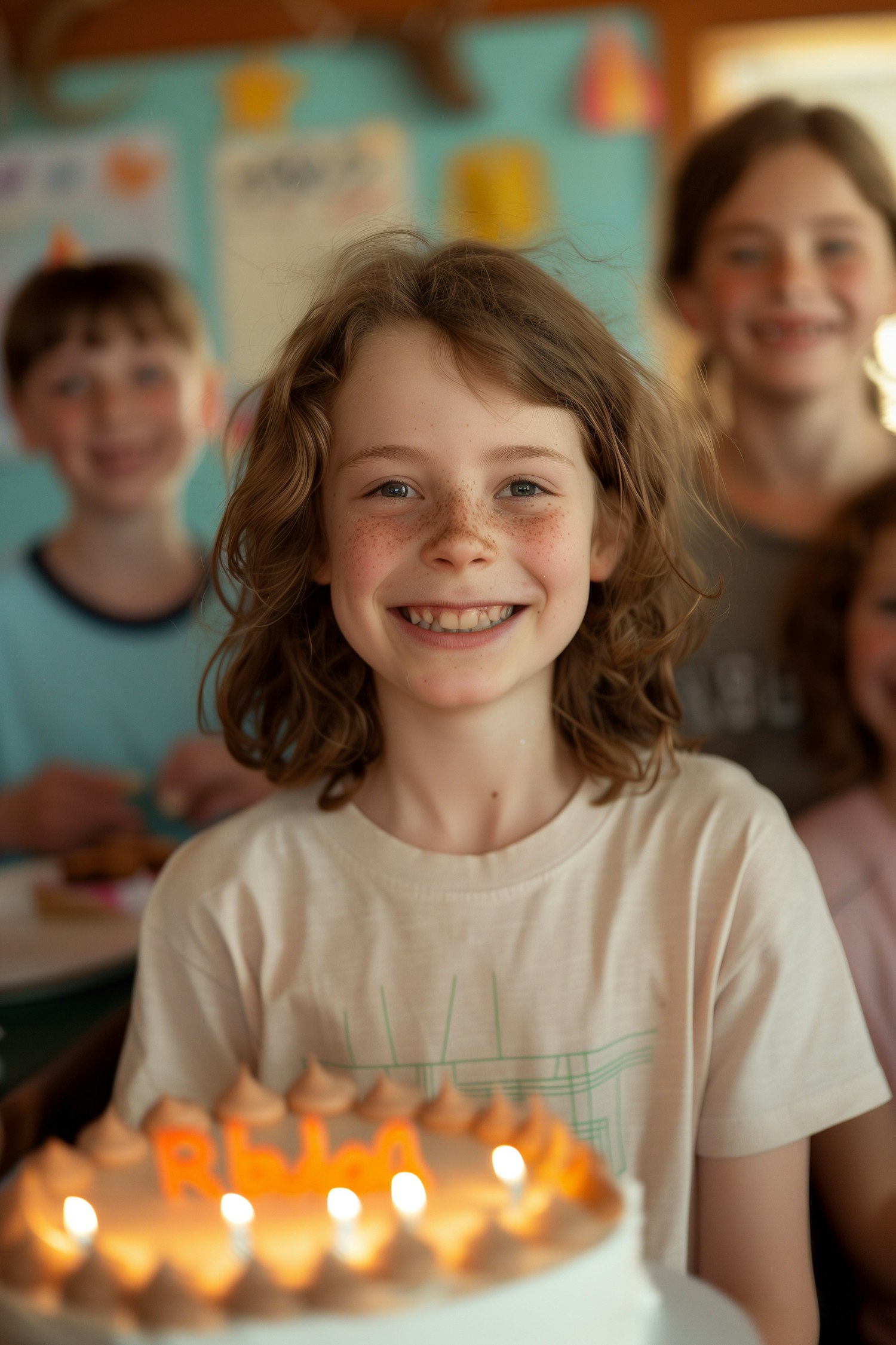 Smiling child with birthday cake and candles, surrounded by friends in a festive setting. Warm lighting and colorful decorations enhance the joy.