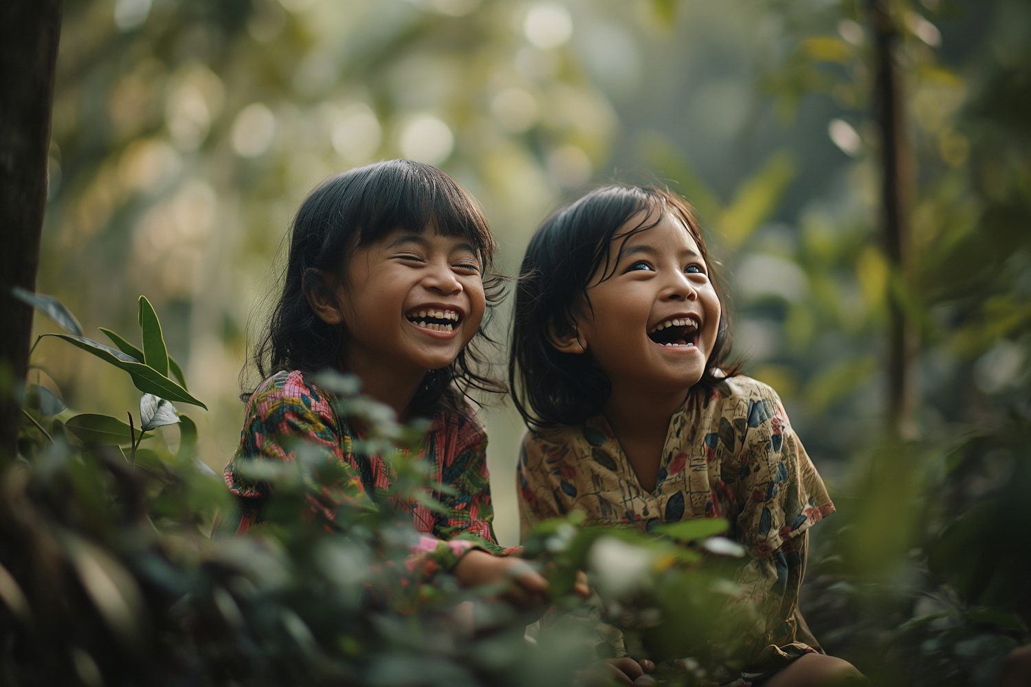 Two young girls laughing joyfully in a lush forest, surrounded by vibrant greenery and sunlight filtering through the leaves.