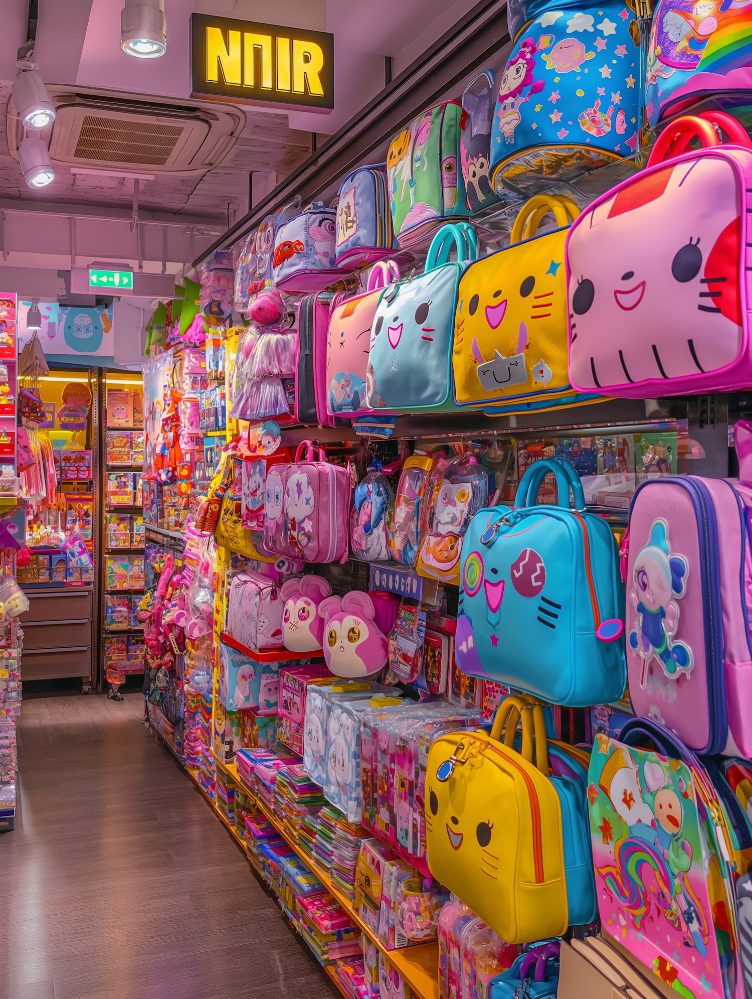Colorful toy store aisle with vibrant backpacks and toys, creating a cheerful and inviting shopping experience.