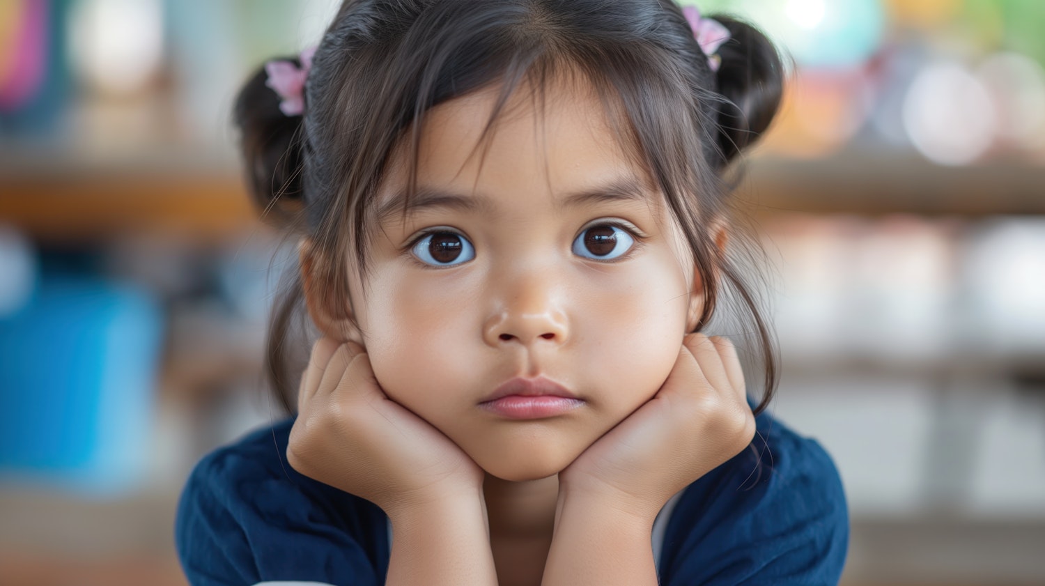 Adorable young girl with expressive eyes and hair in buns, resting her chin on her hands. Soft indoor lighting enhances her thoughtful gaze.