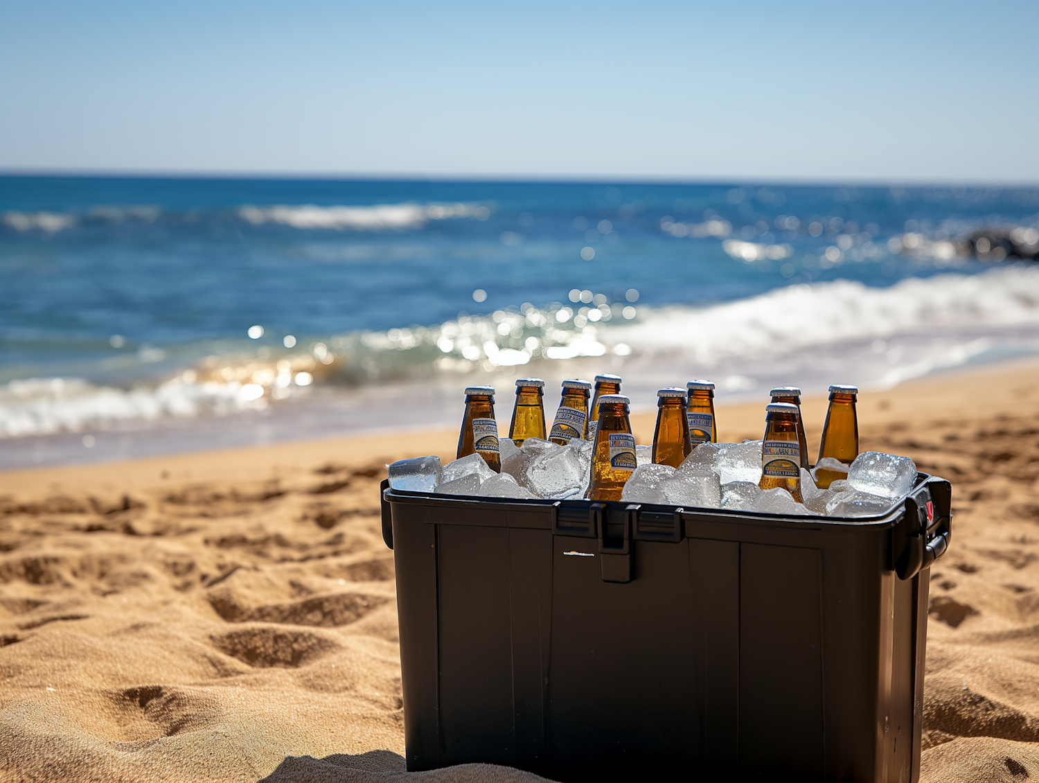Cooler with ice and beer bottles on a sunny beach, ocean waves in the background, perfect for a relaxing day.