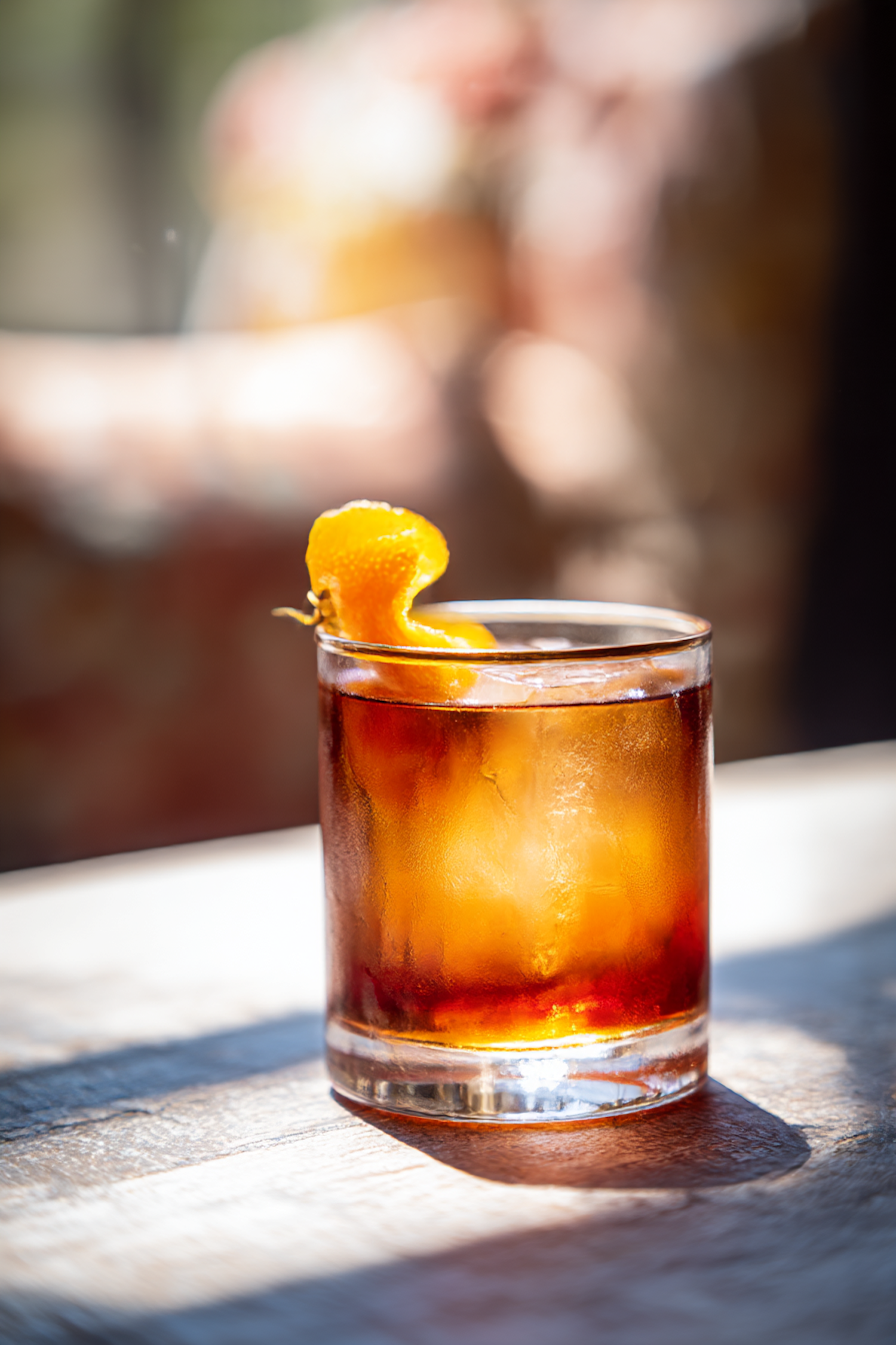 A chilled cocktail with a twist of orange peel, served in a glass on a sunny day, perfect for a refreshing moment.
