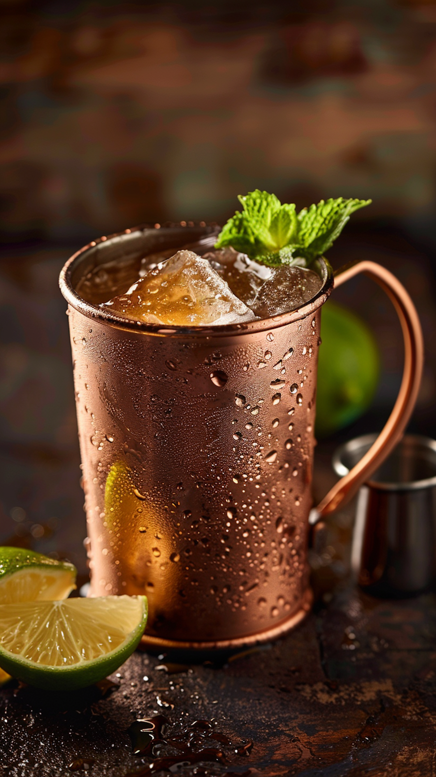 Copper mug with icy cocktail, mint garnish, and lime slice. Rustic setting with lime wedge and jigger nearby.