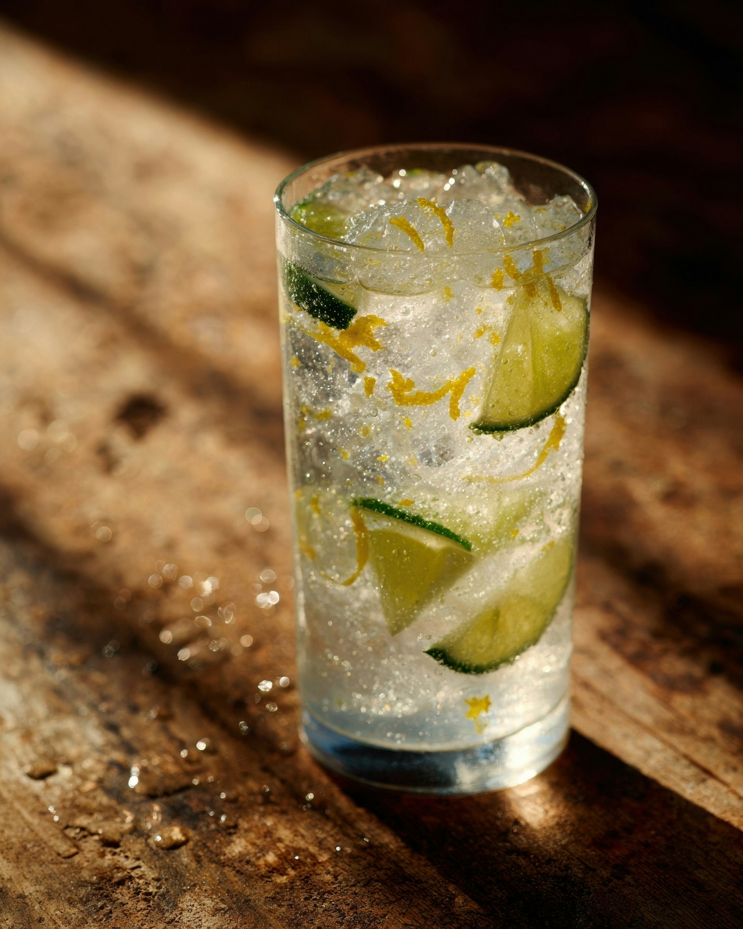 A refreshing glass of crushed ice, lime wedges, and lemon zest on a rustic wooden table, perfect for a sunny day.