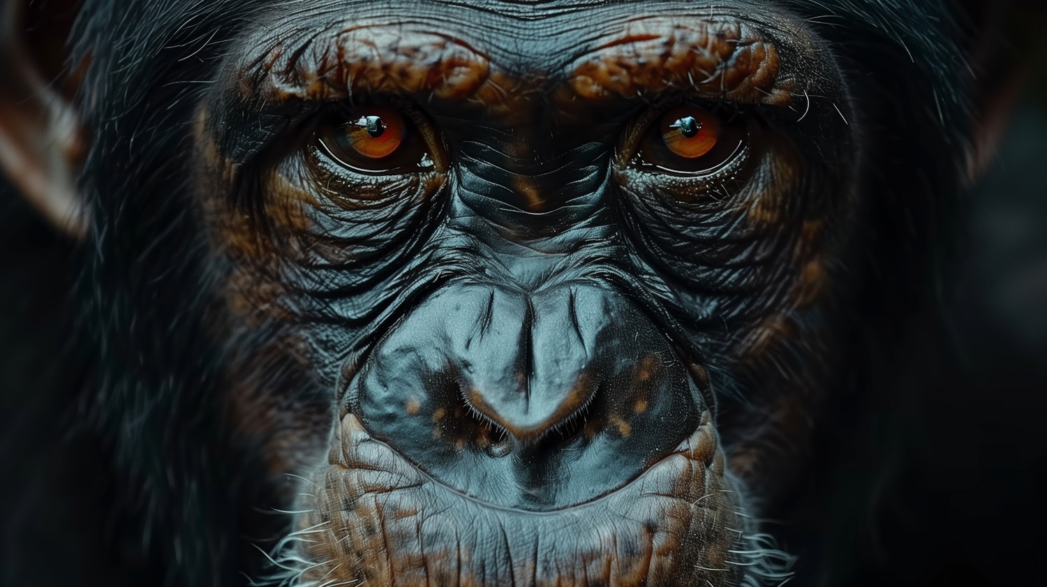 Close-up of a chimpanzee's face with detailed skin texture and striking amber eyes, capturing a calm and contemplative expression.