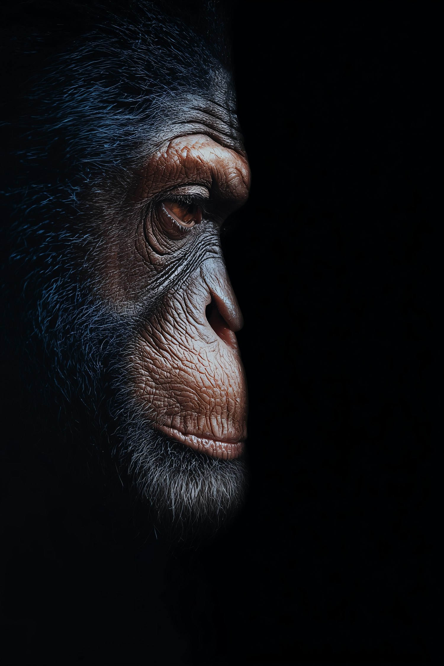 A dramatic close-up of a chimpanzee's face in profile, showcasing its textured skin and fur against a dark background.