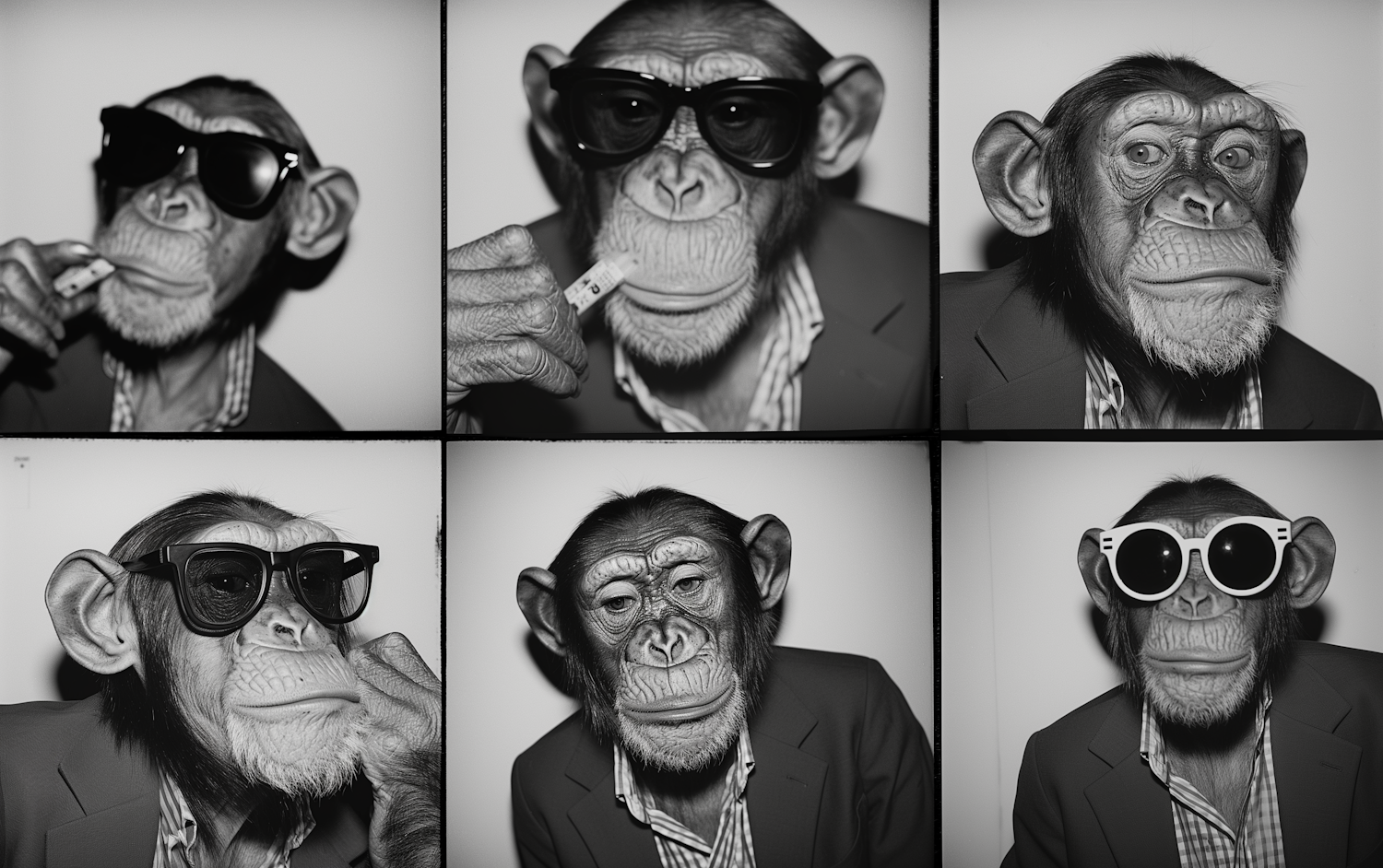 Chimpanzee in a suit and sunglasses, playfully applying lipstick in a series of black and white photos.