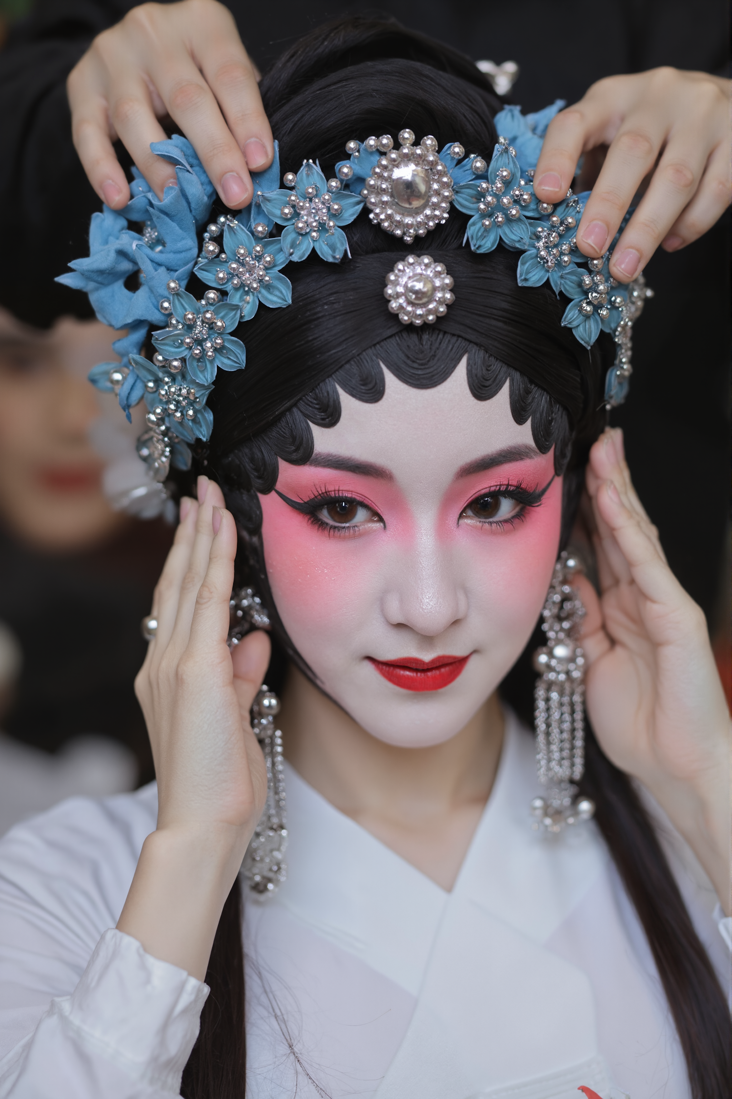Close-up of a woman in traditional Chinese opera makeup, with a pearl-adorned headpiece and vibrant pink and red tones.