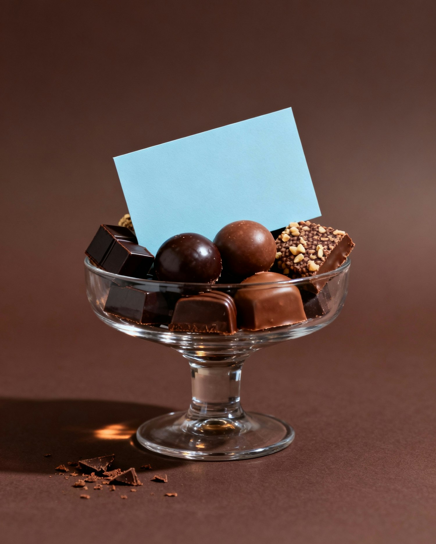A premium studio photograph of assorted artisanal chocolates presented inside an elegant glass dessert coupe. Use a solid dark brown background, uniform and smooth, with soft diffused lighting creating gentle shadows. Inside the coupe, arrange a variety of chocolate pieces: glossy dark chocolate squares, milk chocolate pralines, rounded chocolates and textured pieces with nut crumbs. Among the chocolates, insert a very light blue card, completely blank with no text or design. The card should be placed standing upright, held between the chocolates, with its bottom edge slightly buried so it stays vertical. The top edge of the card must be clearly visible above the chocolates, tilted very slightly backward for a natural look. Place a few small chocolate crumbs around the base of the coupe on the surface for realism. Lighting should be warm and soft, highlighting the textures of the chocolates and creating subtle reflections on the glass coupe. Photography style: luxurious, minimal, modern, refined still life. Mood: premium, artisanal, elegant.