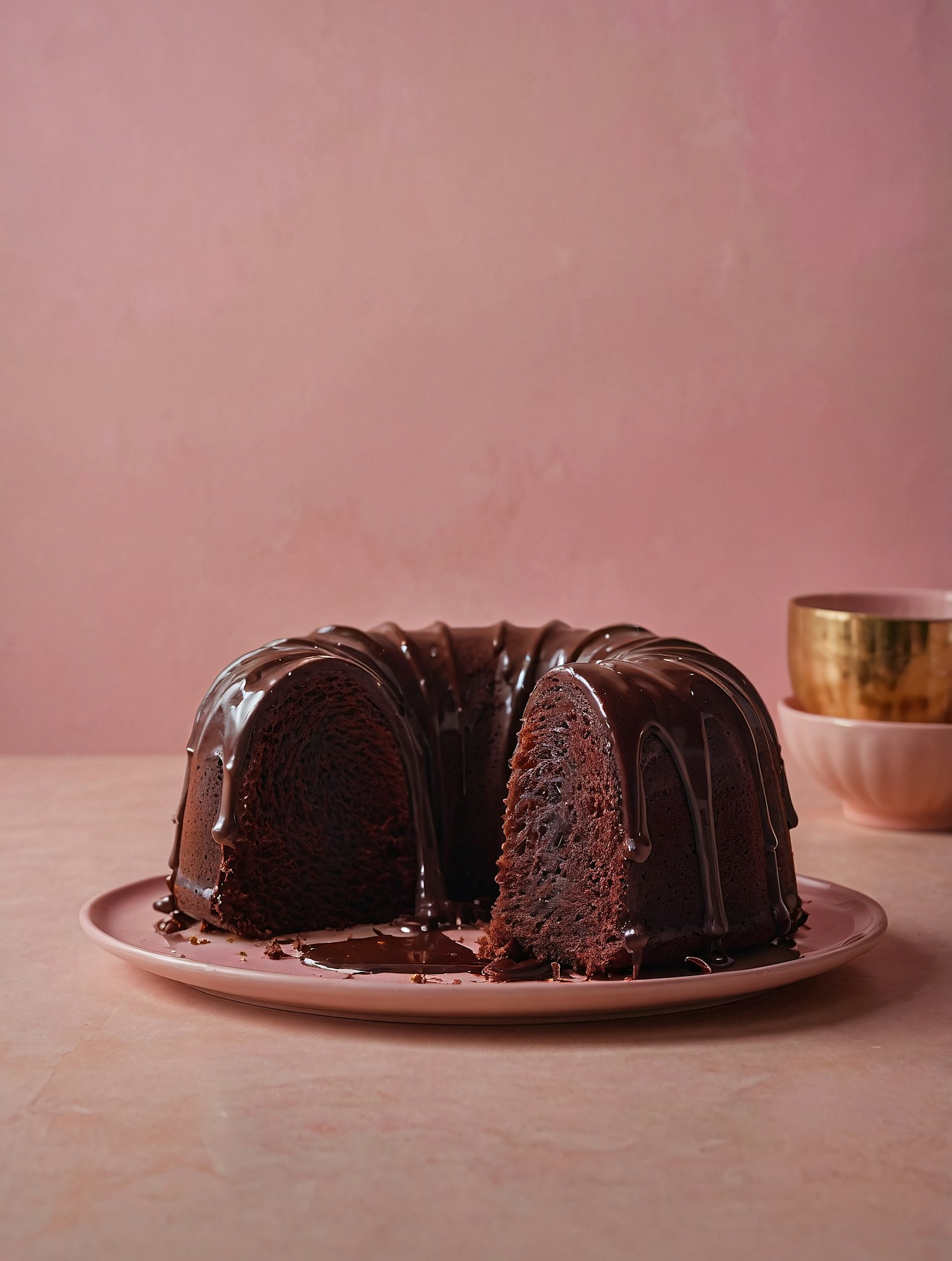 Decadent chocolate bundt cake with glossy ganache on a pink plate, paired with gold and pink bowls for a stylish dessert presentation.