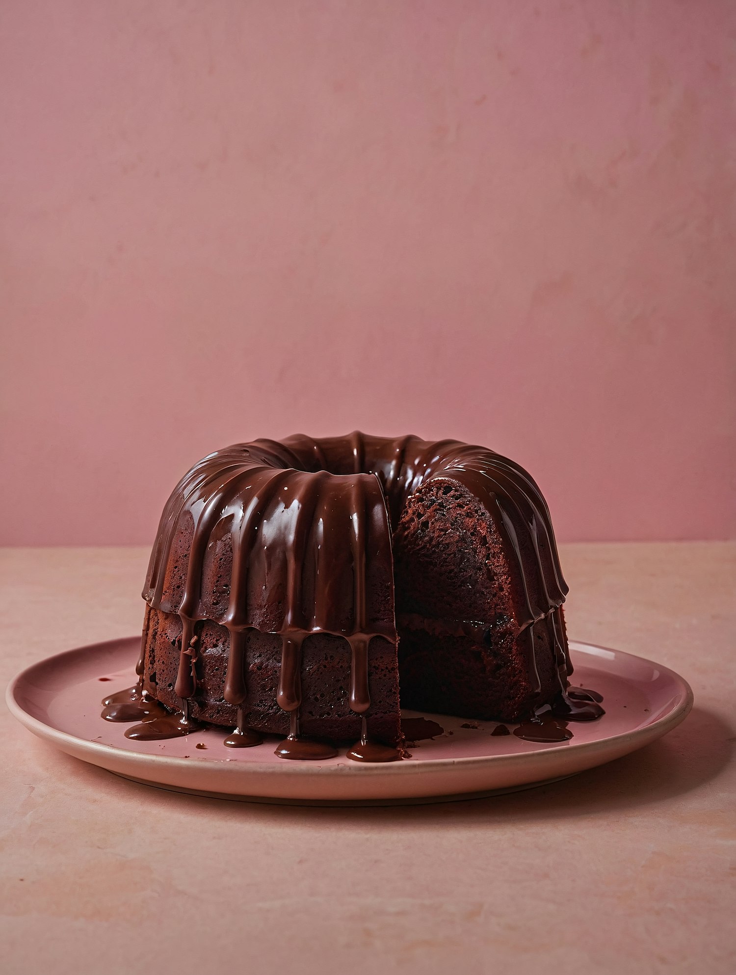 Decadent chocolate bundt cake with glossy ganache drizzle on a pink plate, perfect for dessert lovers. A slice reveals its rich interior.