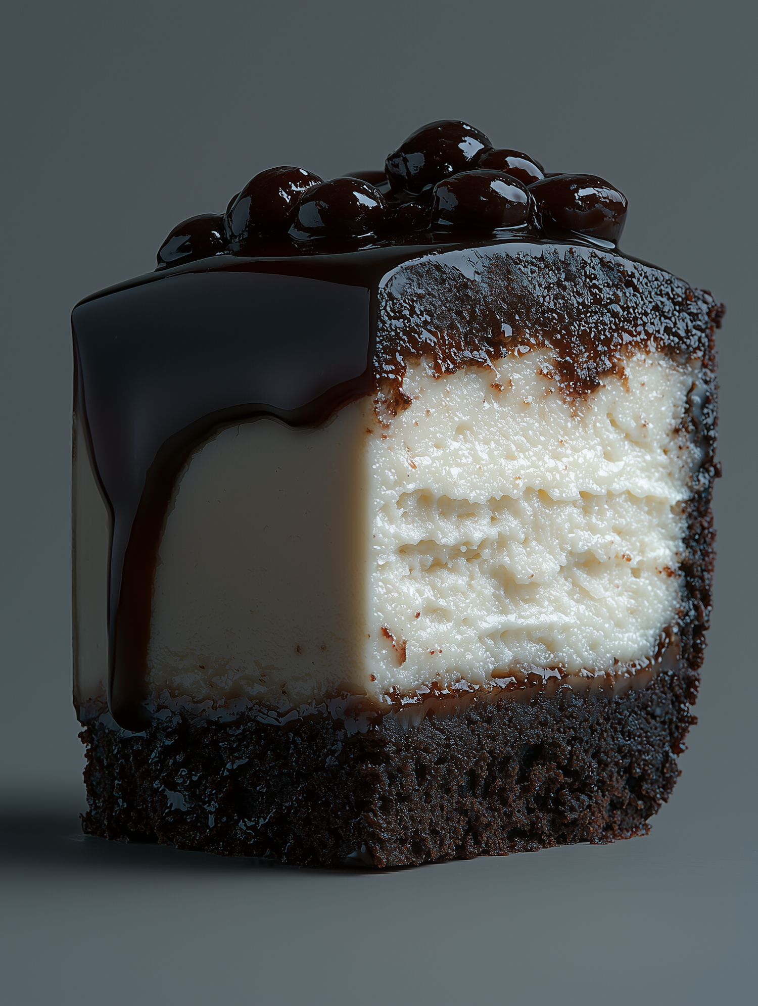 Decadent cheesecake slice with chocolate crust, ganache topping, and cherries. Rich textures and glossy finish create an indulgent look.