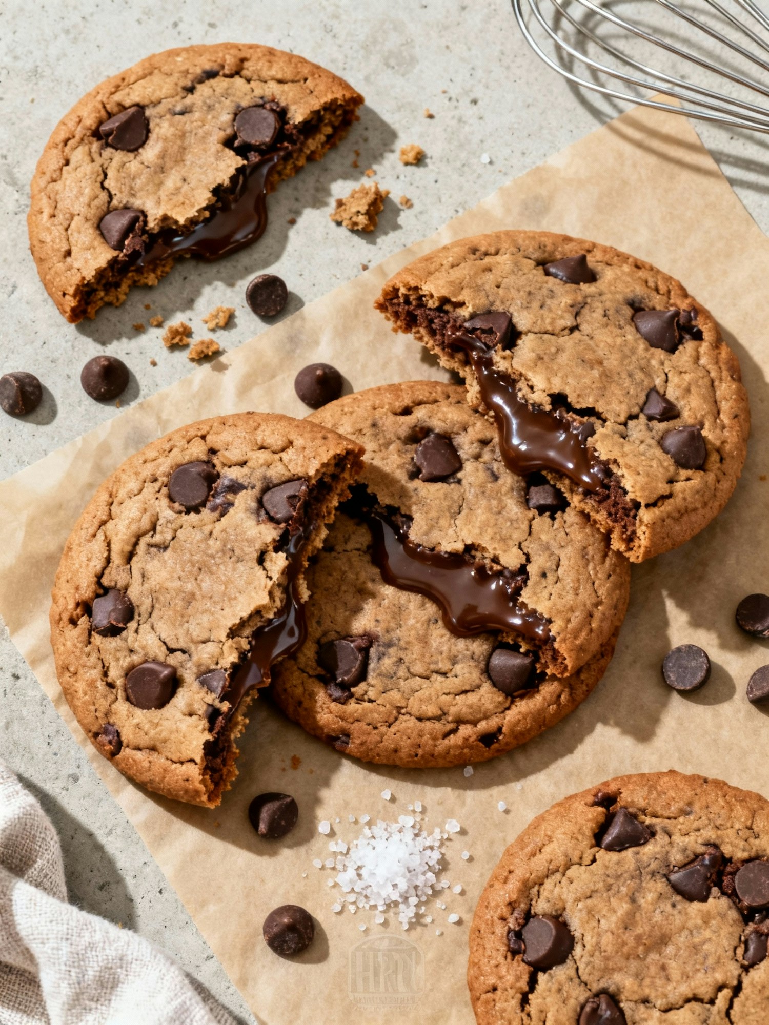 Freshly baked chocolate chip cookies with gooey centers, scattered chocolate chips, and a sprinkle of sea salt on parchment paper.