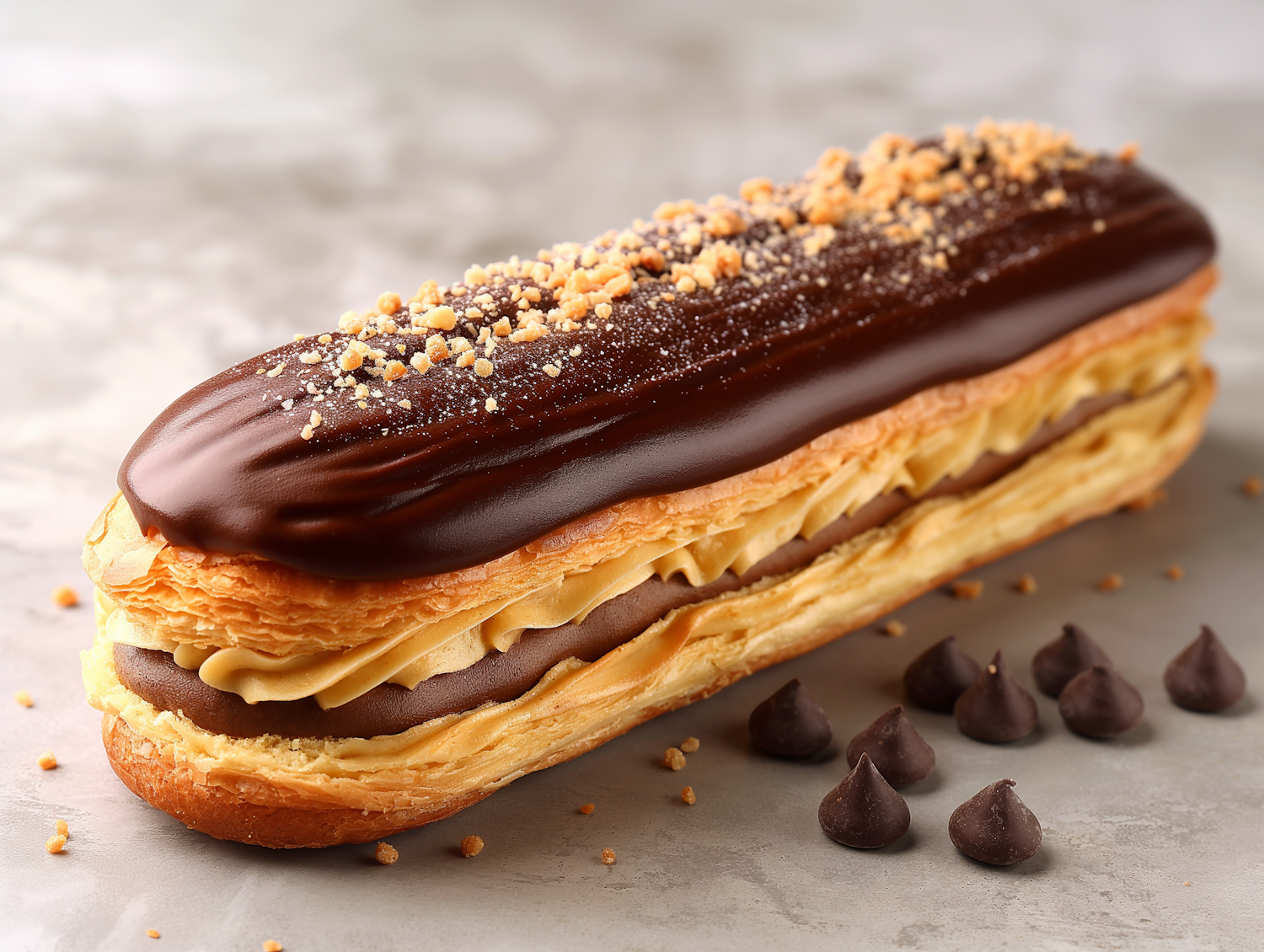 Delicious éclair with chocolate glaze and crunchy topping, set on a gray surface with scattered chocolate chips.