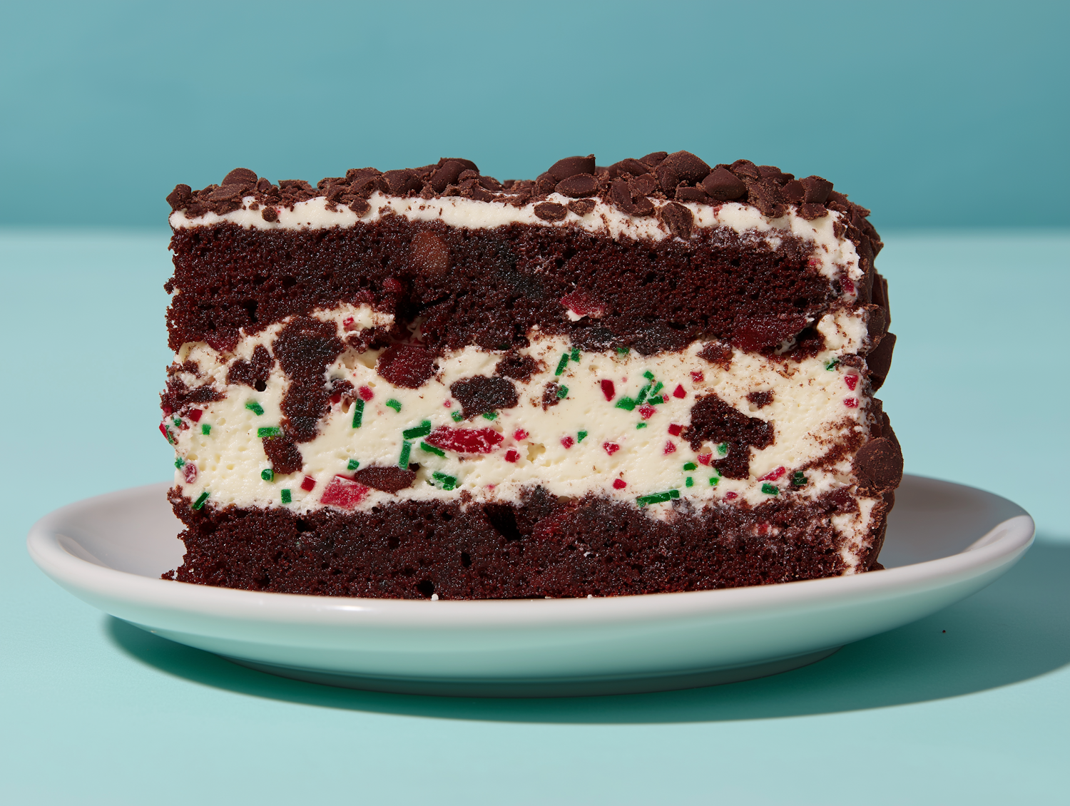Close-up of a chocolate cream plated cake slice with vibrant sprinkles and chocolate topping on a white plate against a light blue backdrop.