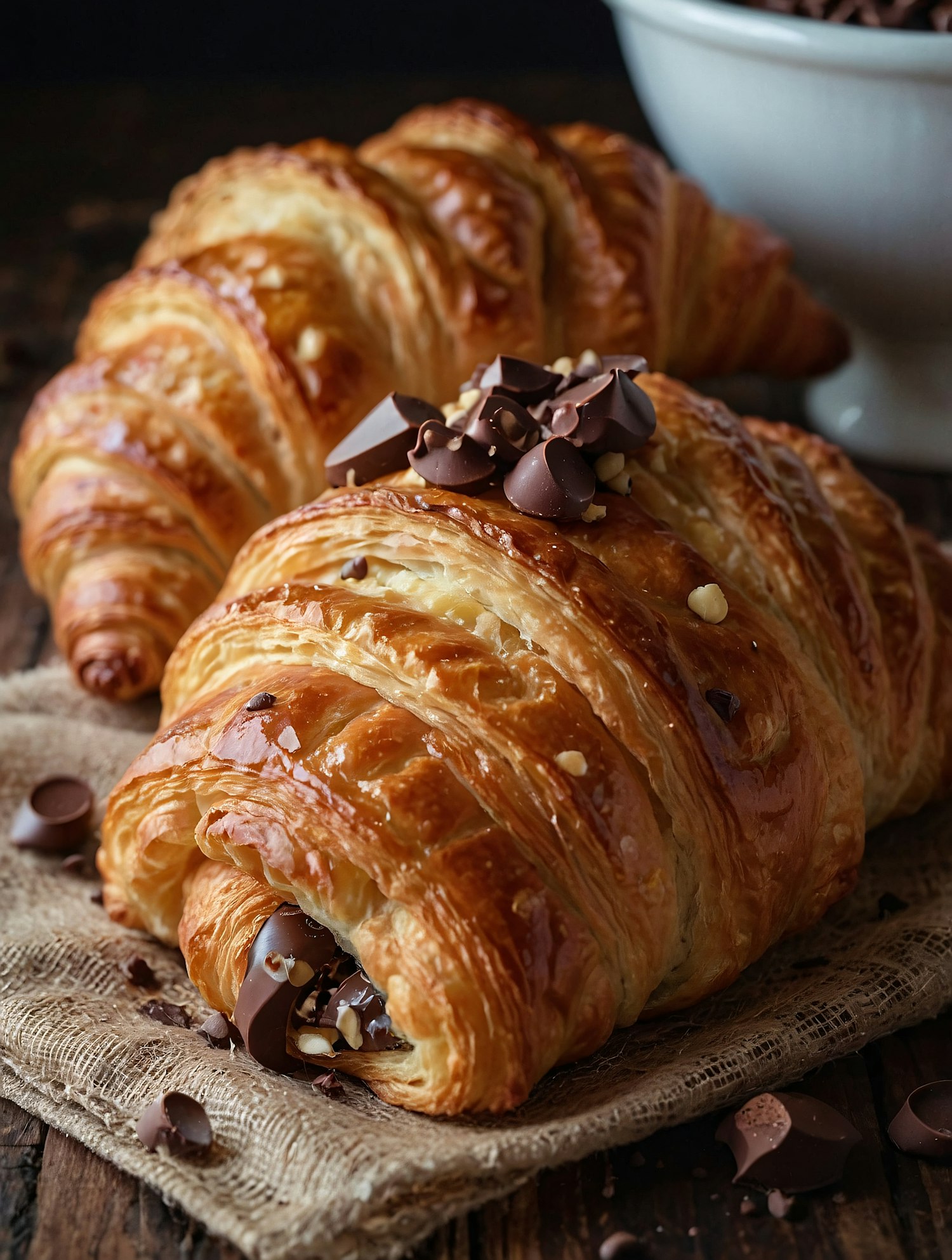 Golden croissants filled with melted chocolate and topped with nuts and chocolate chunks, set on rustic burlap with a bowl of chocolate chips.