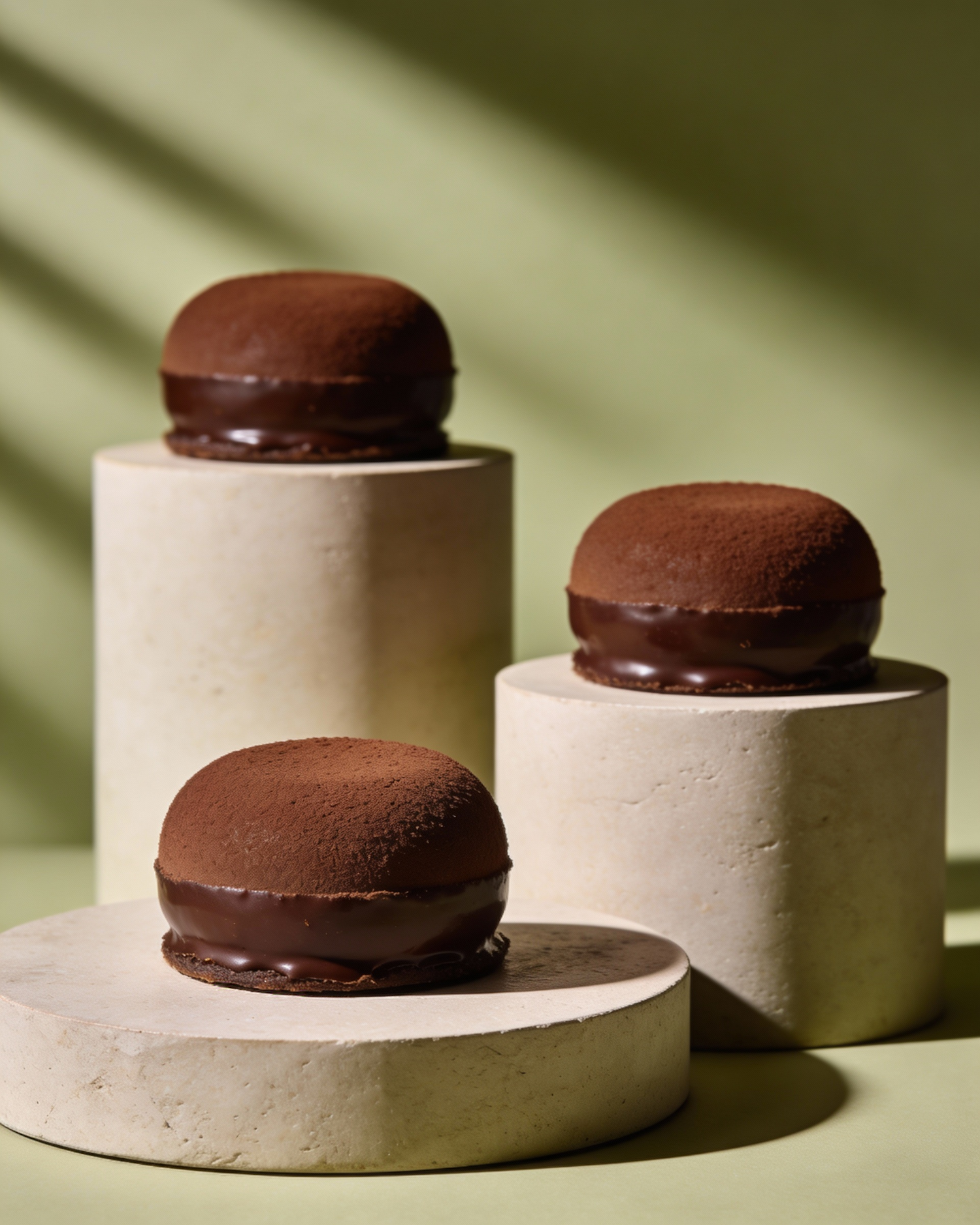 editorial luxury pastry photography, high-end studio food photography, soft directional light from one side, subtle long shadows, calm and refined atmosphere, pale khaki green background, cylindrical pedestals and round platforms in matte mineral texture and the same khaki green color of the background, soft matte surfaces mixed with glossy accents, sculptural composition, minimalist but rich in volume, premium color grading, shallow depth of field, ultra realistic textures, macro-level detail, no text, three identical round chocolate entremets placed on separate cylindrical pedestals at different depths, same design and decoration, strong sense of rhythm and repetition, focus on luxury consistency