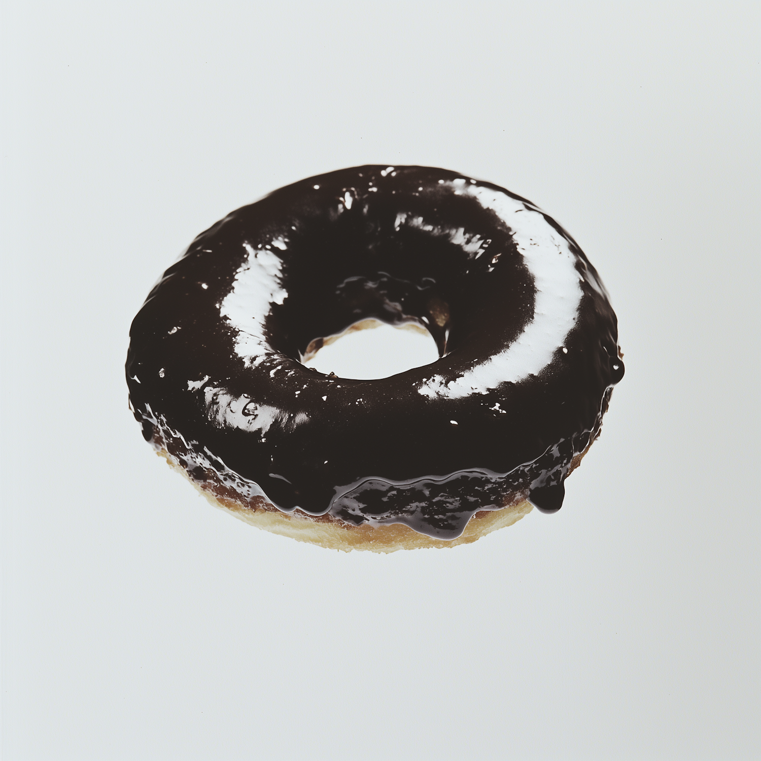 A delicious chocolate-glazed donut with a glossy finish, set against a clean white background. Perfect for dessert lovers!