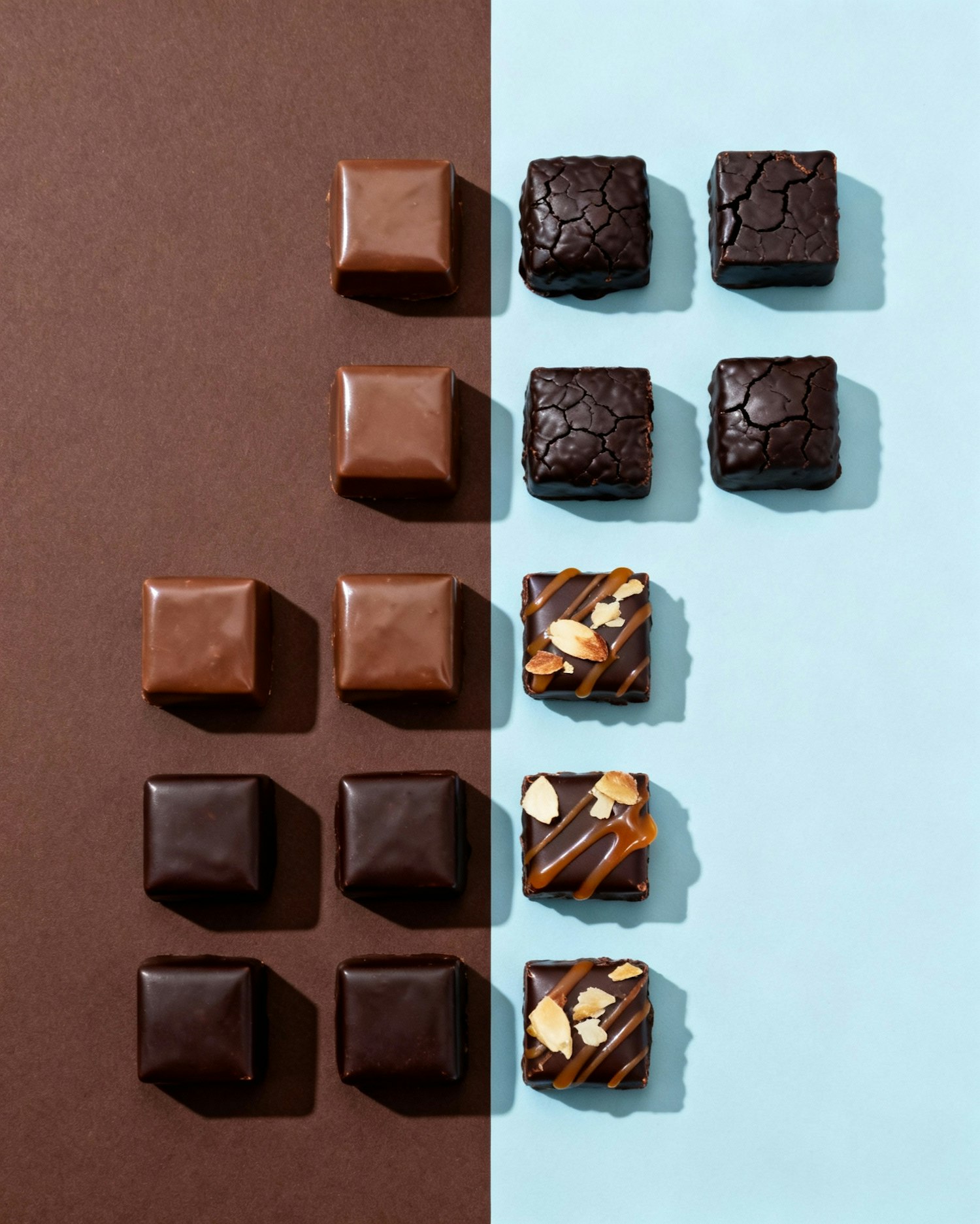 A premium flat-lay photograph of assorted artisanal chocolates arranged in clean diagonal rows. Use a two-tone background split vertically: – one side in deep dark brown (rich cocoa brown), – the other side in a very light pastel blue (soft powder blue). Make the separation between the two colors perfectly straight and sharp. Include different types of chocolates: glossy squares, textured pralines, pieces with nuts or caramel details, a mix of milk and dark chocolate tones. Lighting should be soft studio light, with gentle shadows and warm highlights to enhance the chocolate textures. Style: elegant, modern, minimal, gourmet confectionery photography.