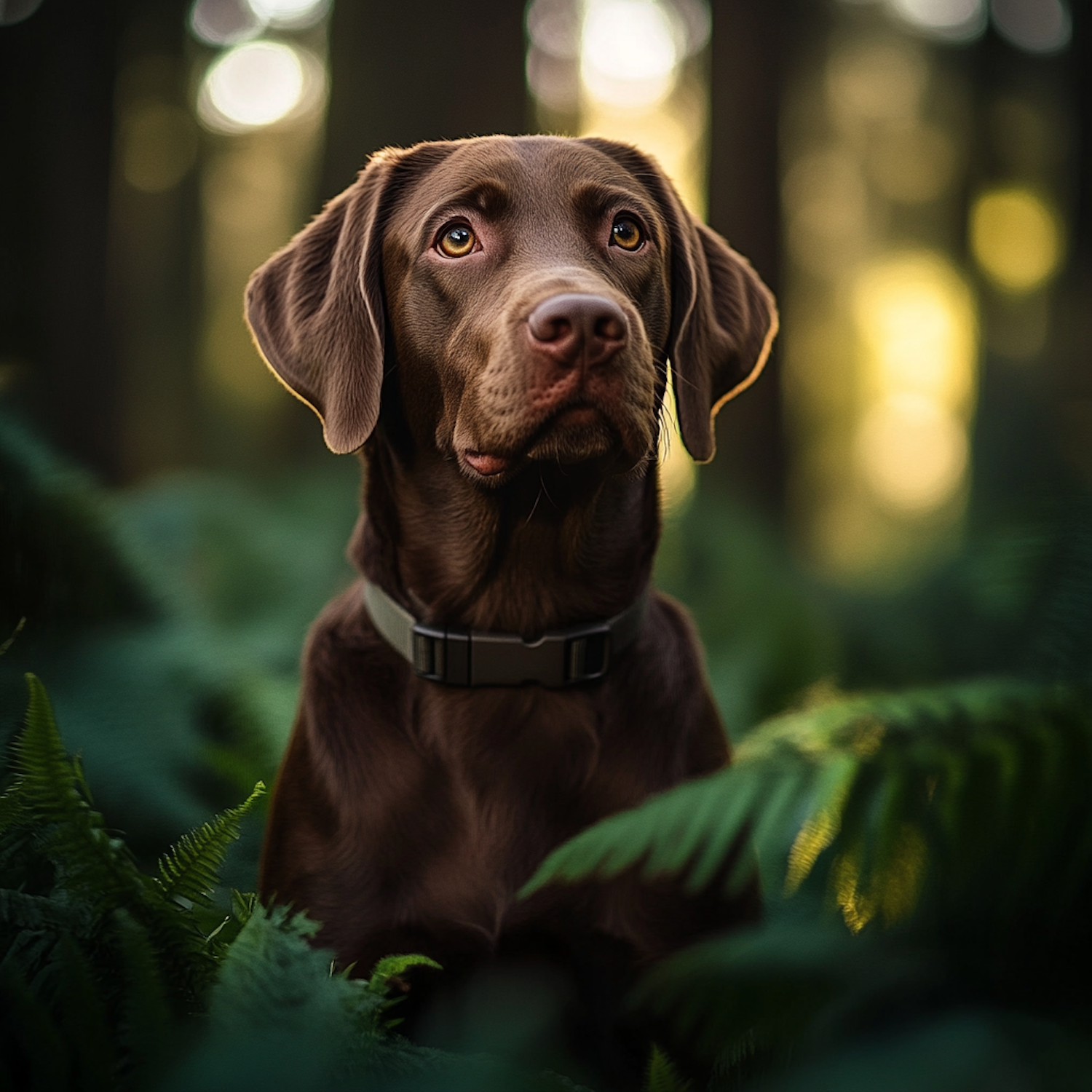 Chocolate Labrador in a serene forest setting, surrounded by lush ferns and dappled sunlight, exuding calm and curiosity.