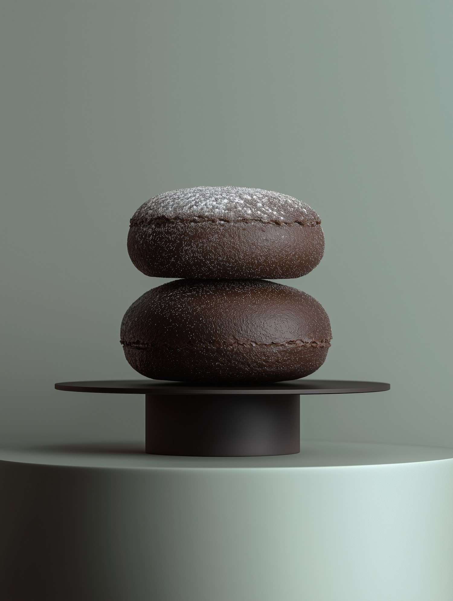 Elegant stack of chocolate macarons on a modern pedestal with a minimalist green background.
