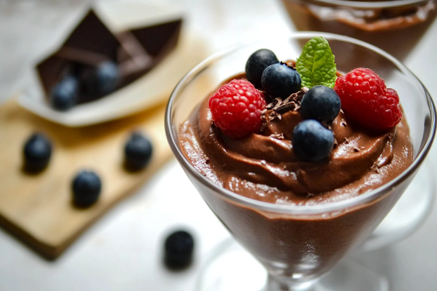 Decadent chocolate mousse topped with fresh raspberries, blueberries, mint, and chocolate shavings. Perfect for a sweet indulgence!