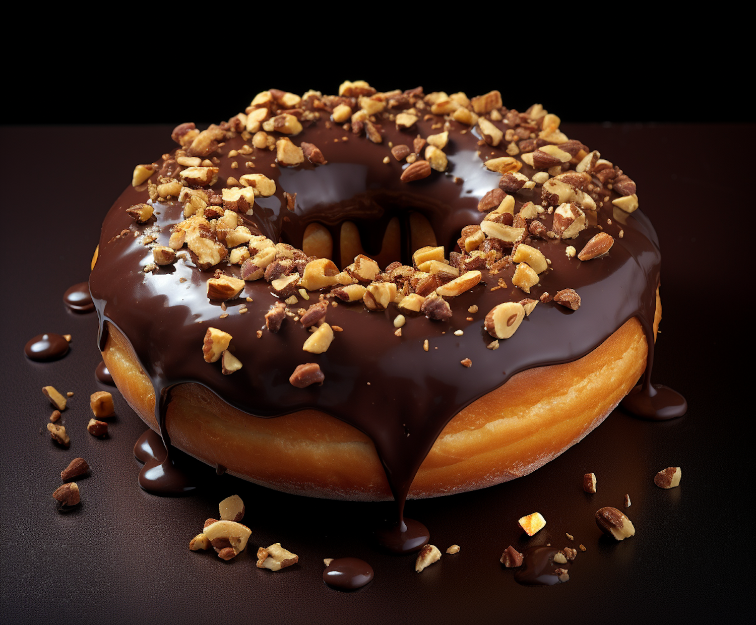 Mouthwatering donut with glossy chocolate glaze and crunchy nut topping on a dark background, highlighting its rich texture and appeal.