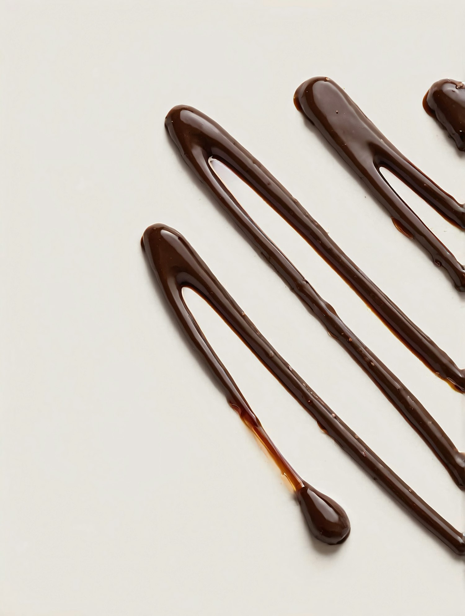 Rich, glossy streaks of dark chocolate sauce drizzled diagonally on a beige background, showcasing a creamy and indulgent texture.