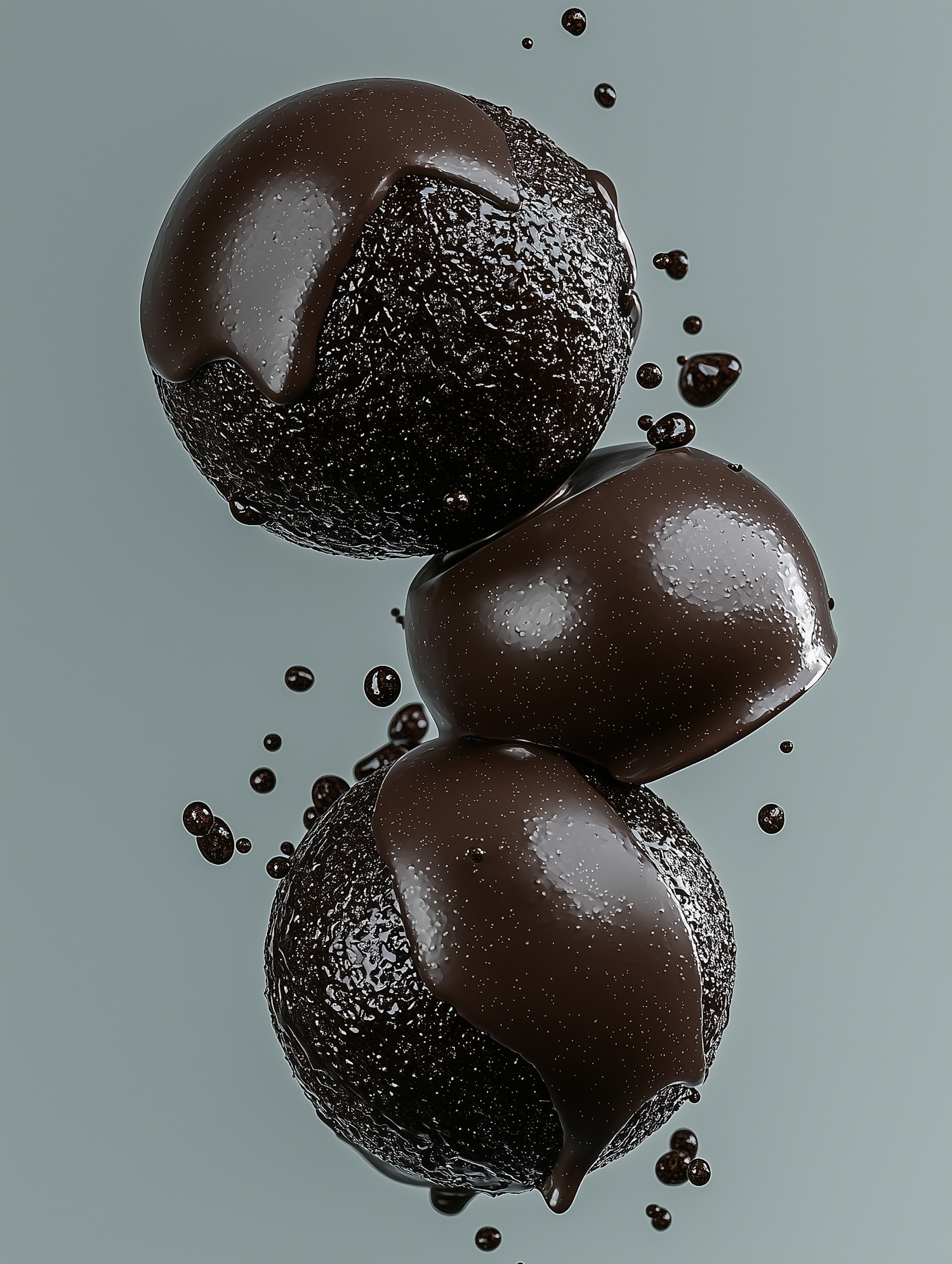 Three glossy chocolate spheres with droplets suspended in air, set against a teal background, creating a luxurious and indulgent visual.