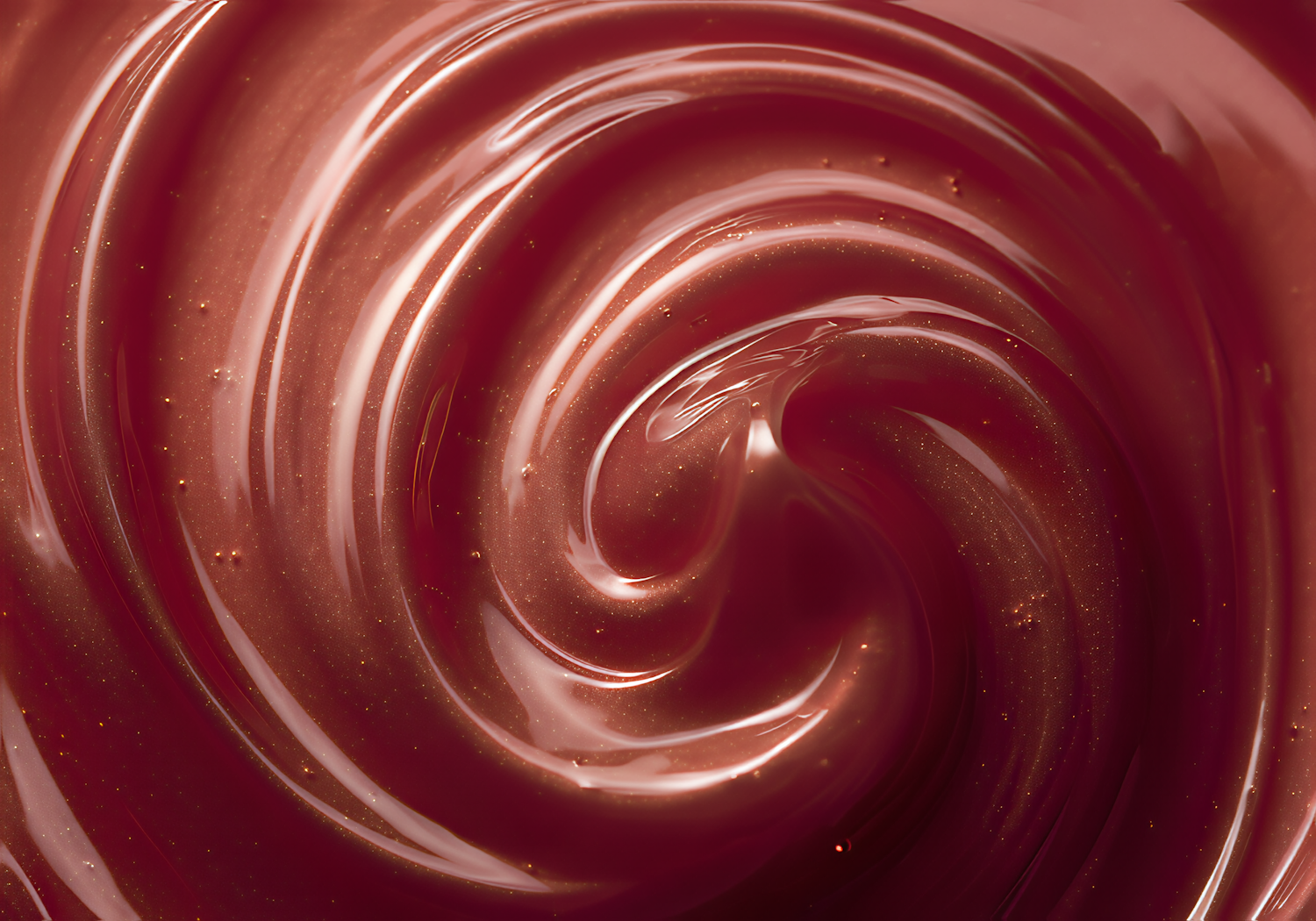Close-up of a glossy swirl of chocolate or caramel with rich brown tones and golden highlights.