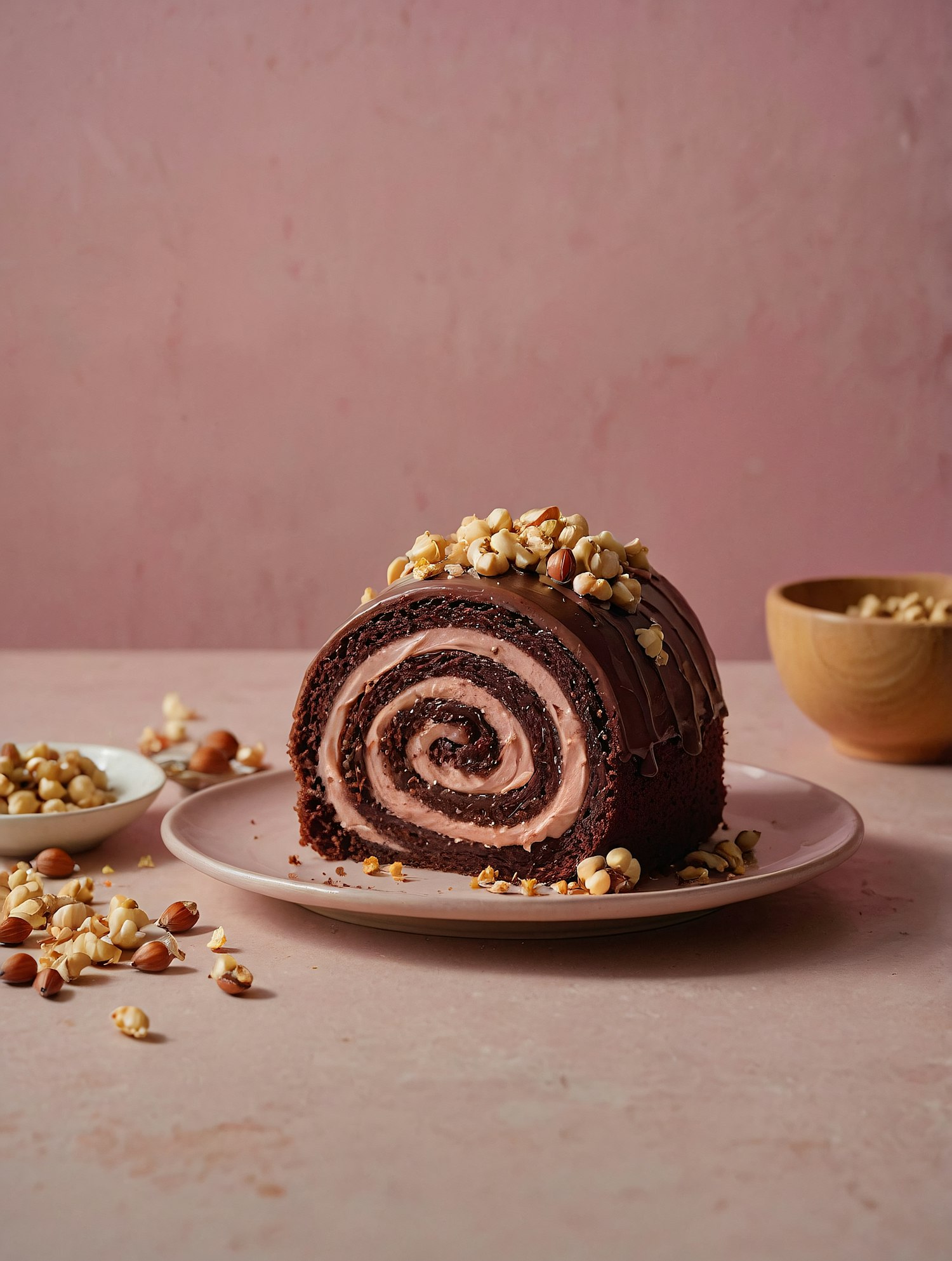Rich chocolate Swiss roll with creamy filling, ganache drizzle, and hazelnuts on a pink plate. Perfect for dessert lovers!
