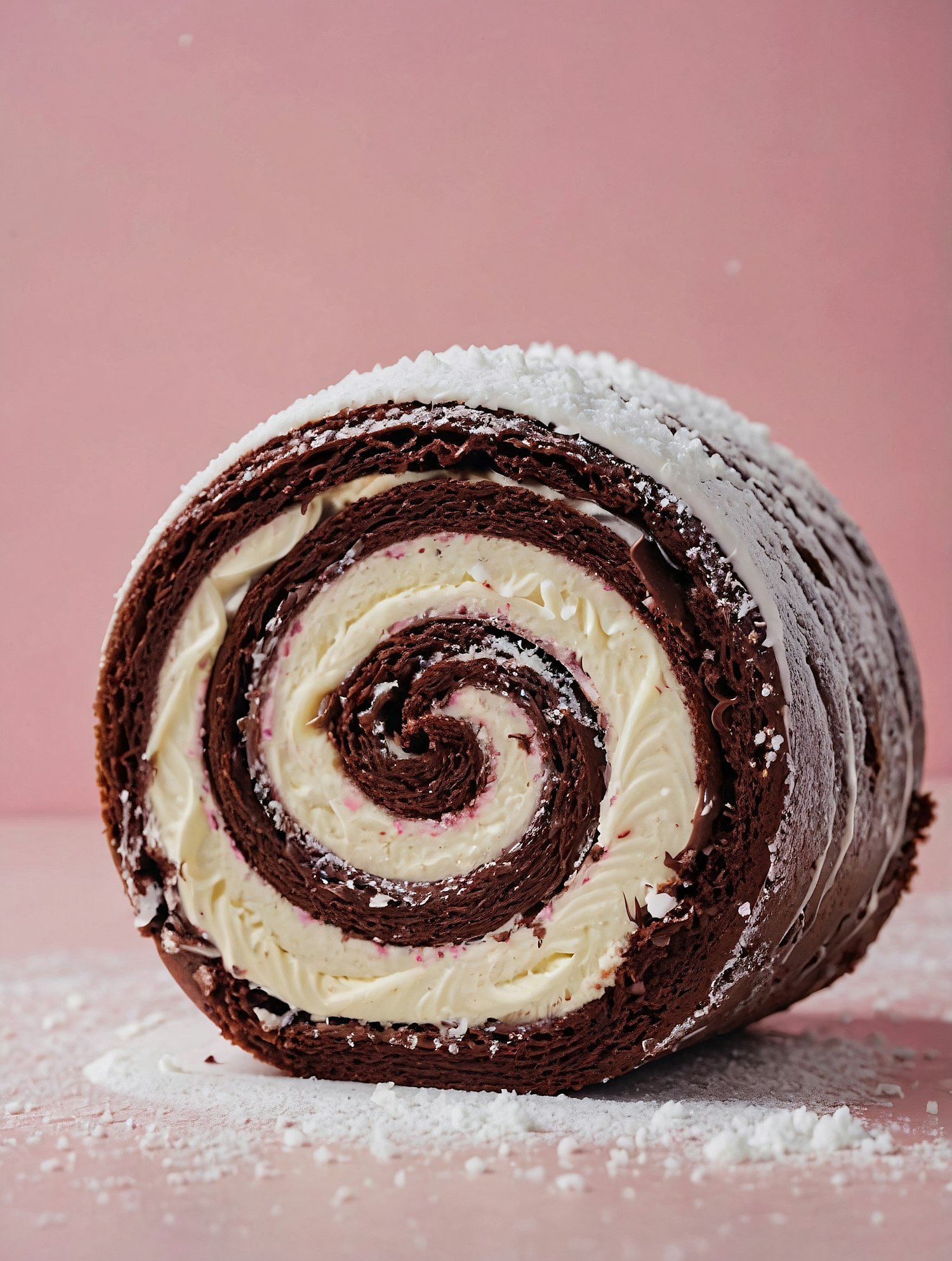 Delicious chocolate Swiss roll with creamy filling, dusted with powdered sugar on a soft pink background. Perfect for dessert lovers!