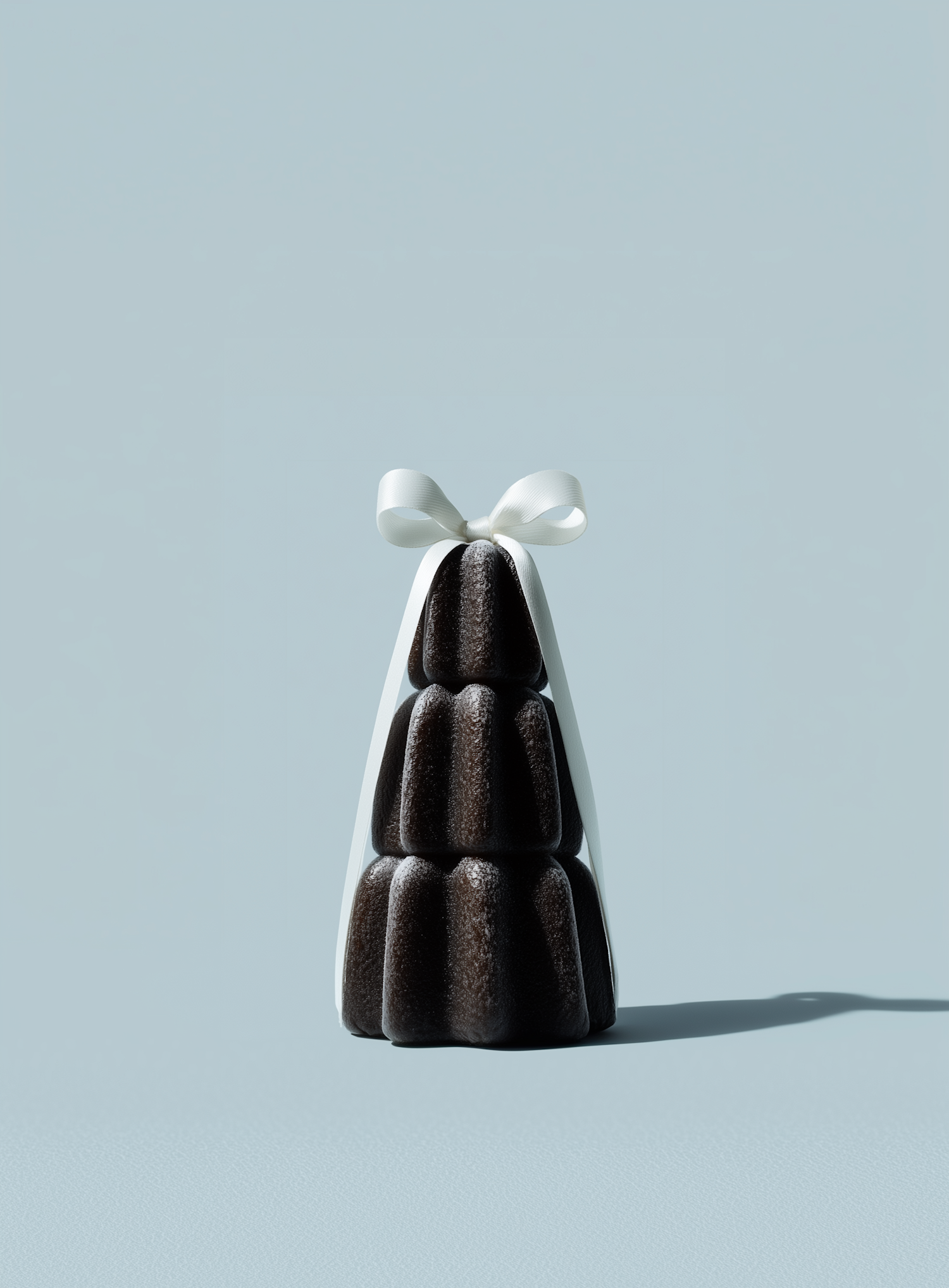 A tiered chocolate dessert with a white ribbon bow on top, set against a light blue background, creating a minimalist and elegant look.