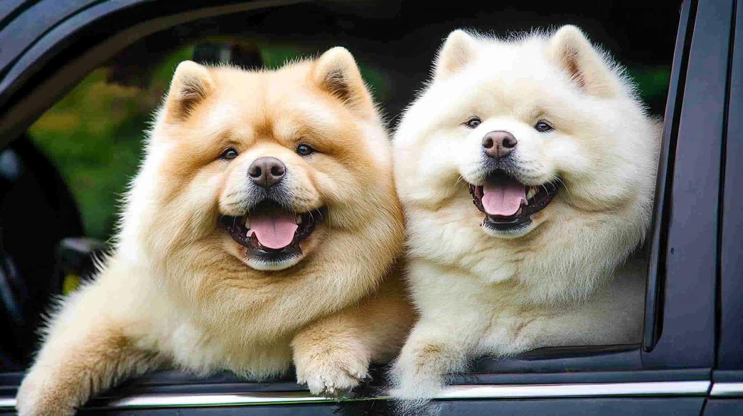 Two fluffy Chow Chows joyfully lean out of a car window, showcasing their thick fur and cheerful expressions.
