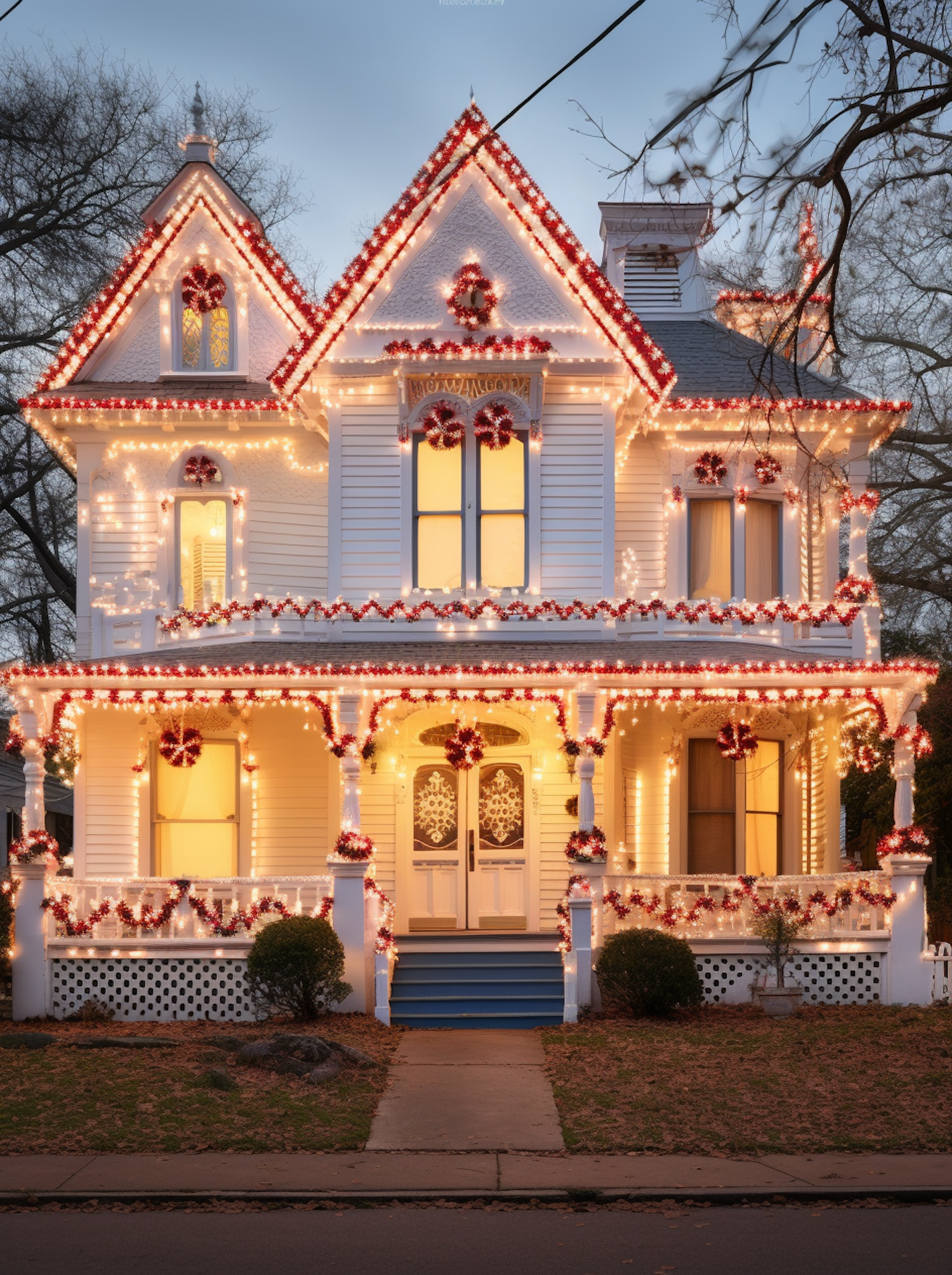 Victorian house beautifully decorated with festive lights and wreaths, creating a warm holiday ambiance in a winter setting.