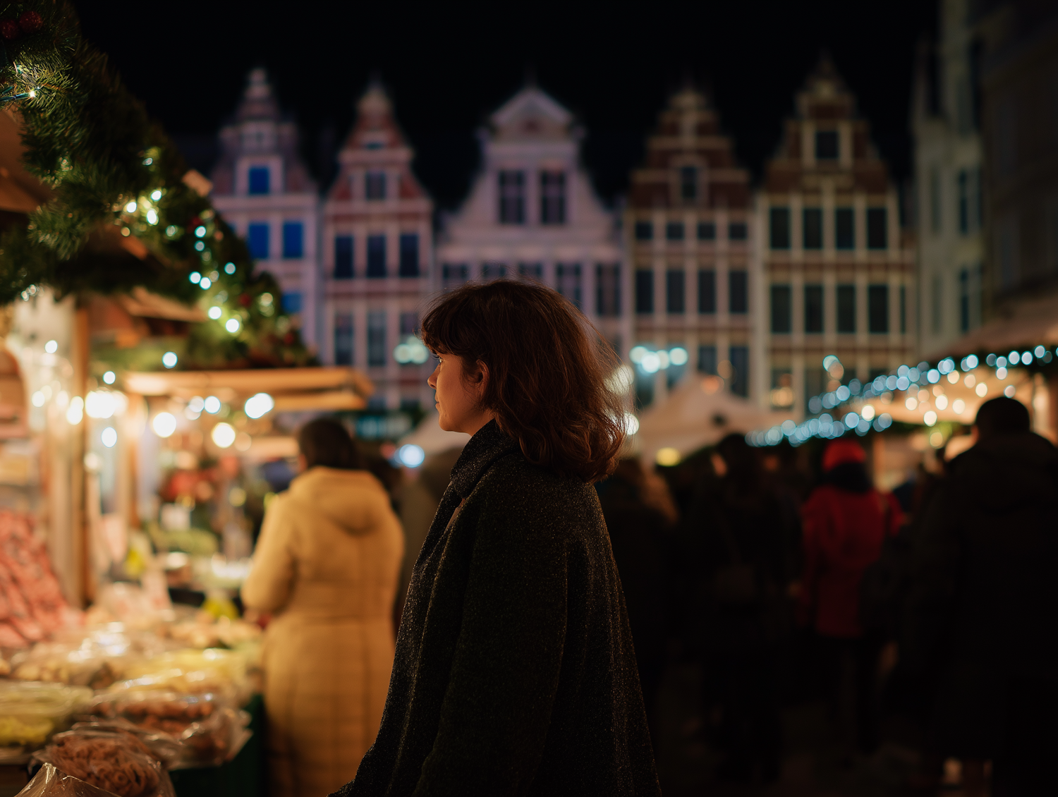 Nighttime Christmas market scene with a woman browsing stalls, glowing festive lights, and traditional European architecture in the background.