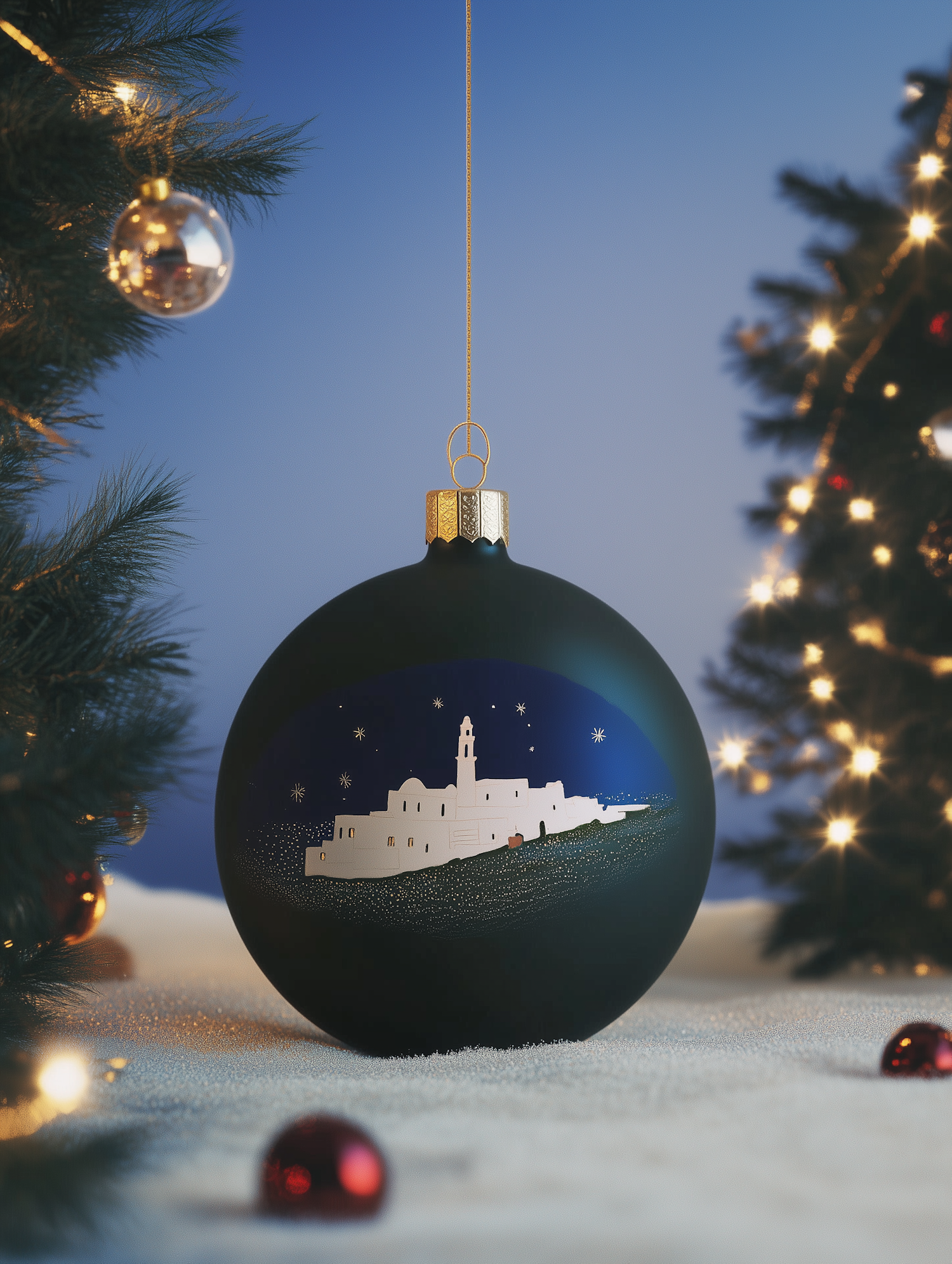 Elegant Christmas ornament with a painted village scene, surrounded by festive lights and snow, evoking a serene holiday atmosphere.