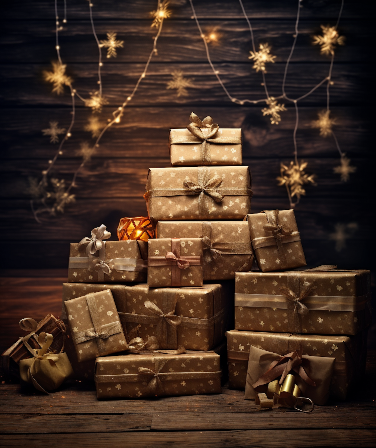 Stack of golden wrapped gifts with ribbons, set against a wooden backdrop with glowing snowflake string lights.