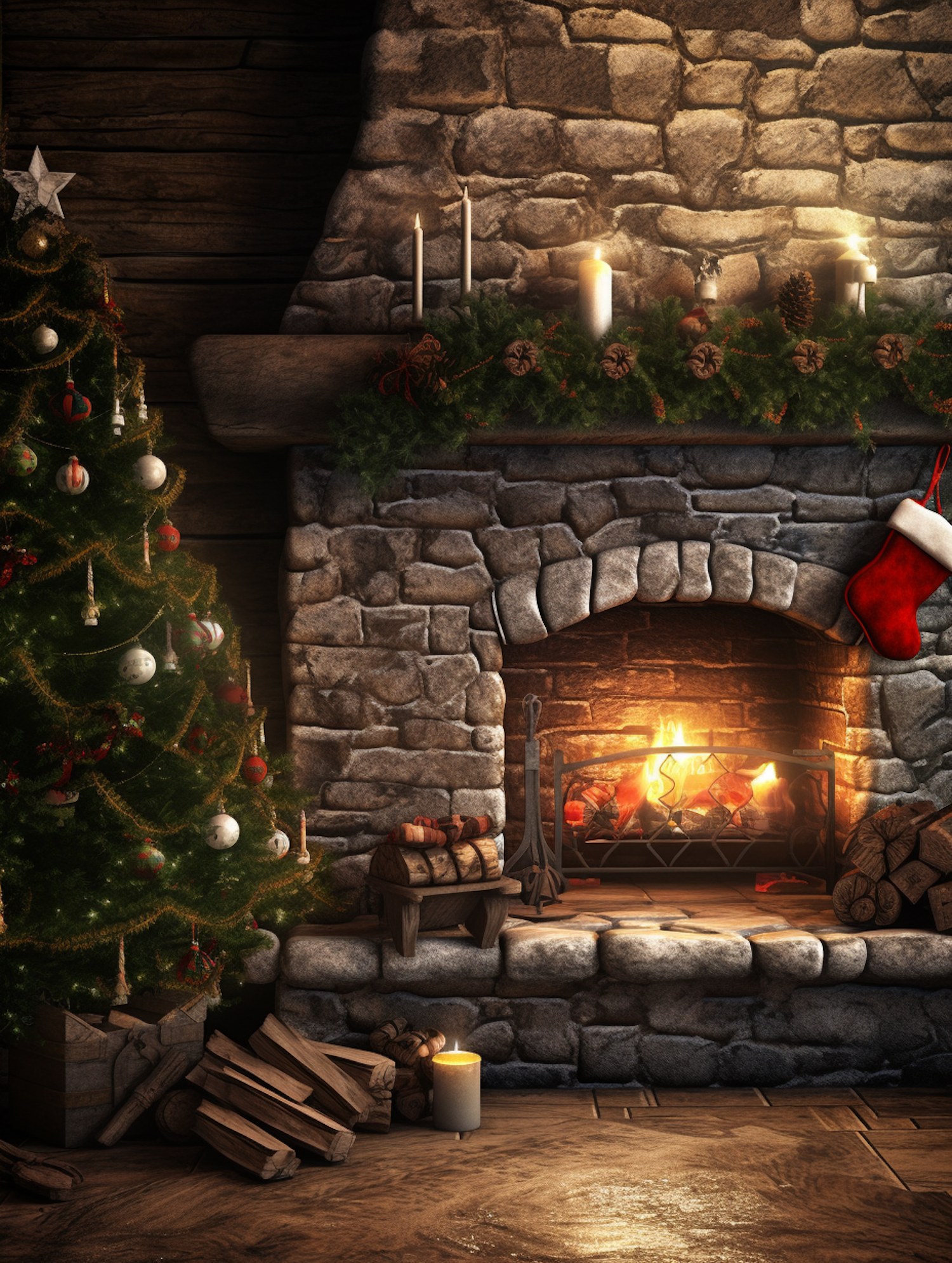 Cozy rustic living room with a stone fireplace, Christmas tree, and festive decorations, creating a warm holiday ambiance.