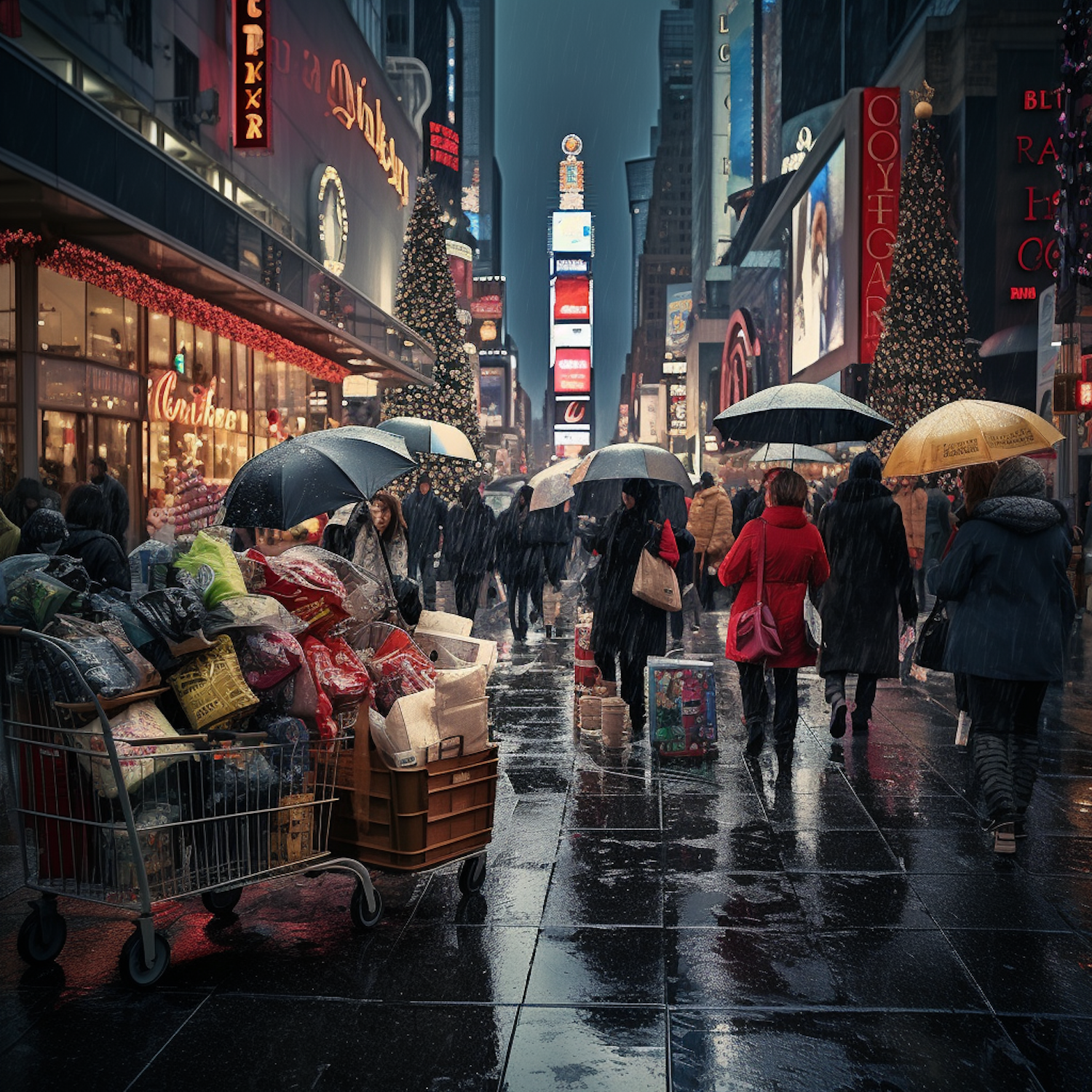 Rainy city street with holiday shoppers under umbrellas, bright lights, and festive decorations. A cart with colorful packages adds to the scene.